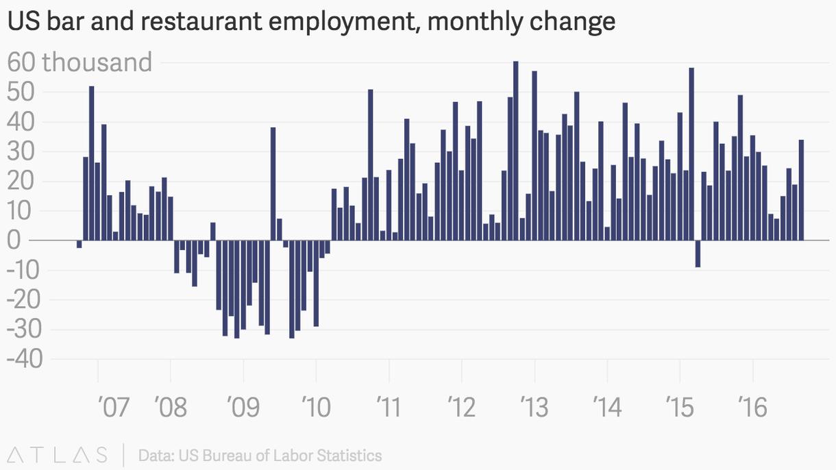 If you’re in need of some extra cash, there’s a good chance you could get a couple shifts as a bartender or waiter somewhere nearby.US eating and drinking establishments hired a robust 34,000 people during August, according to just-released numbers from the US Bureau of Labor Statistics.Except for one month, March 2015, the US restaurants and bars have added jobs for 78 straight months. The longest streak on record.