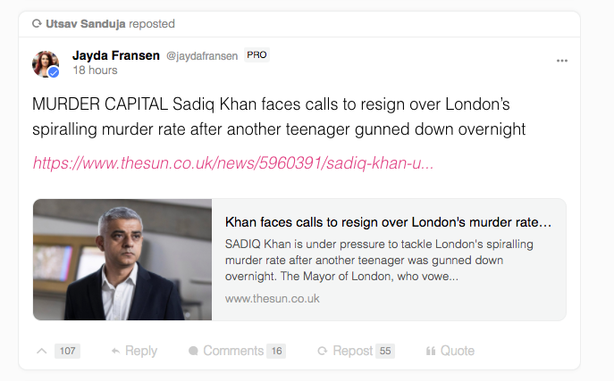 So, who is Gab really aimed at? Their most followed users are alt-right bloggers Milo Yiannopoulos and Paul Joseph Watson, and Gab’s own CEO, Andrew Torba. Torba has used the site to become a conservative voice in his own right, regularly sharing pro-gun and anti-immigration content. Britain First also held an account until just a few weeks ago, when they chose to delete it following their leaders’ conviction of religiously aggravated harassment.