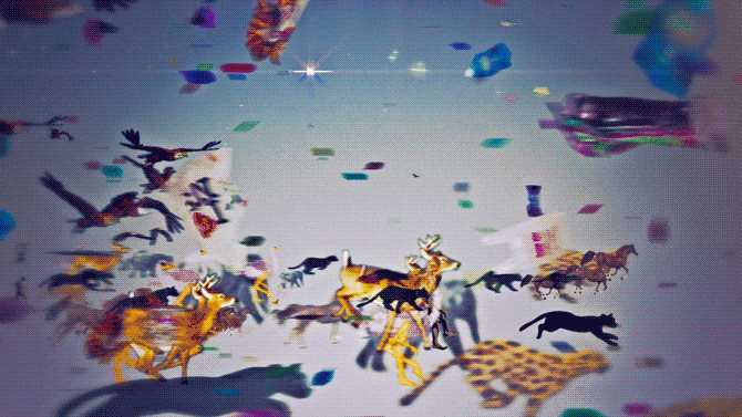 The eye-widening video includes swarms of tropical and exotic images—colorful butterflies, dancing frogs, even a couple cheetahs—surging in a tornado-esque form. The onslaught of vibrant imagery suits the electro-experimental soundscape, which has a tropicalia vibe itself. But look deeper, and within the digital deluge there are biblical reference (locust-looking insects and frogs, for example) juxtaposed with consumer products from today.My Panda Shall Fly, aka Suren Seneviratne, told The Creators Project, "I love Yoshi's work because it is so colorful and fun… his videos are so playful." The producer added, "I felt like Yoshi would be perfect to illustrate my favorite track from the record because he creates feasts for the eyes—just like how I've intended on creating a feast for the ears."To learn more about the collaboration between the artists, we talked with Yoshi Sodeoka about the stimulating new video piece.The Creators Project: You told me off-interview that everyone is free to interpret this video according to his/her own imagination, but you also mentioned the Plagues of Egypt. How would you personally interpret this video?Yoshi Sodeoka: After my first time listening to the track, a scientific article I read about how real-life raining frogs popped into my mind. This is probably because of a combination of the bubbly texture in the track and obviously the title, “Rainfall.” According to the article, raining frogs is a rare weather phenomenon that actually happens. It is actually not supposed to be just frogs though; it could be fish or squid or anything else. So they say. I guess a lot of people tend to draw attention to frogs more than the others because they appear in the [biblical stories]. Anyway, all of these things make it an interesting story. So I took inspiration from that and elaborated my visual ideas.