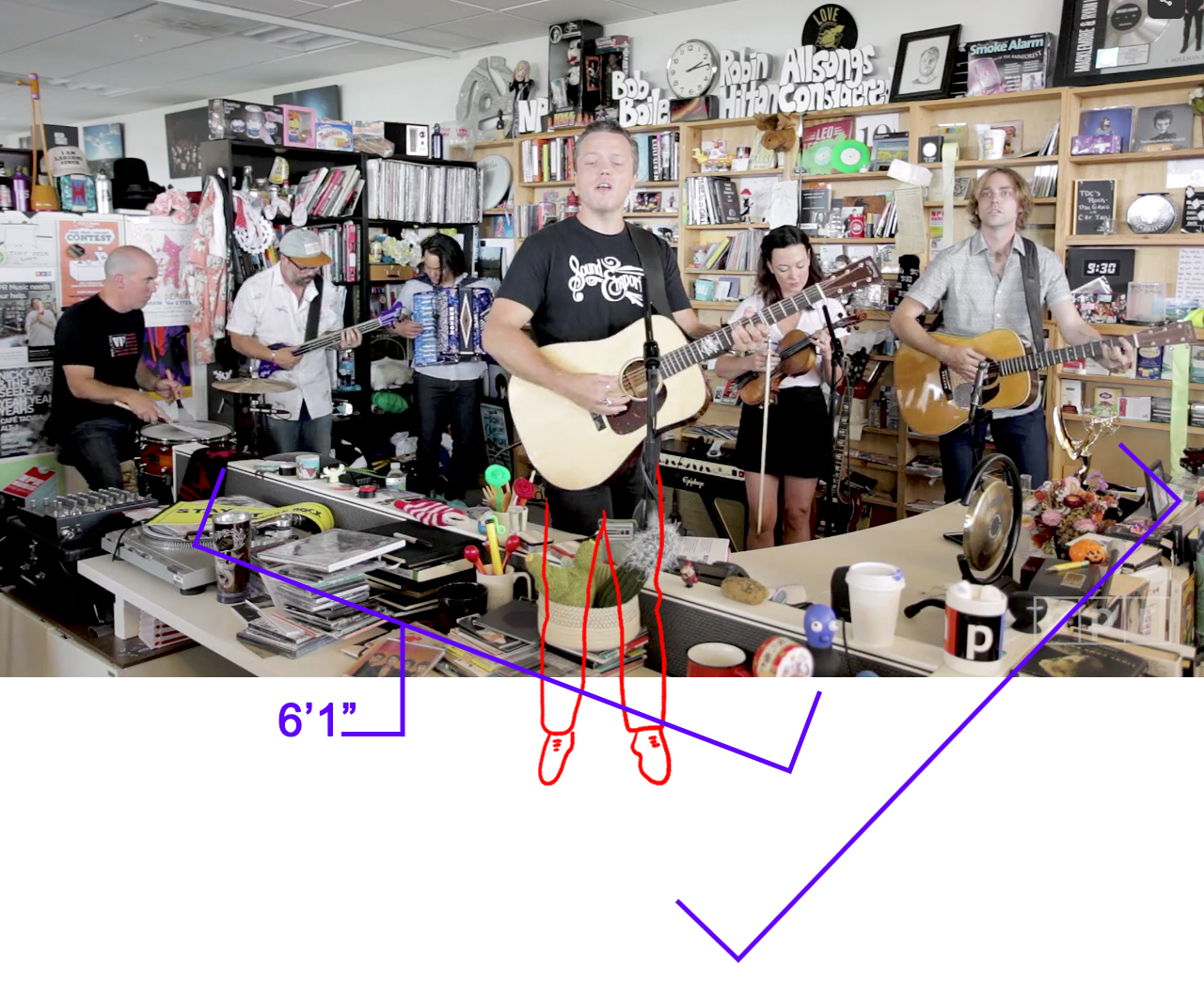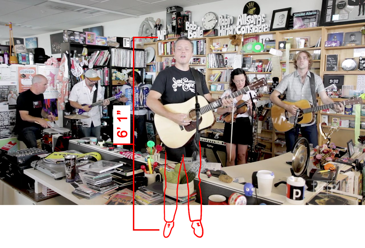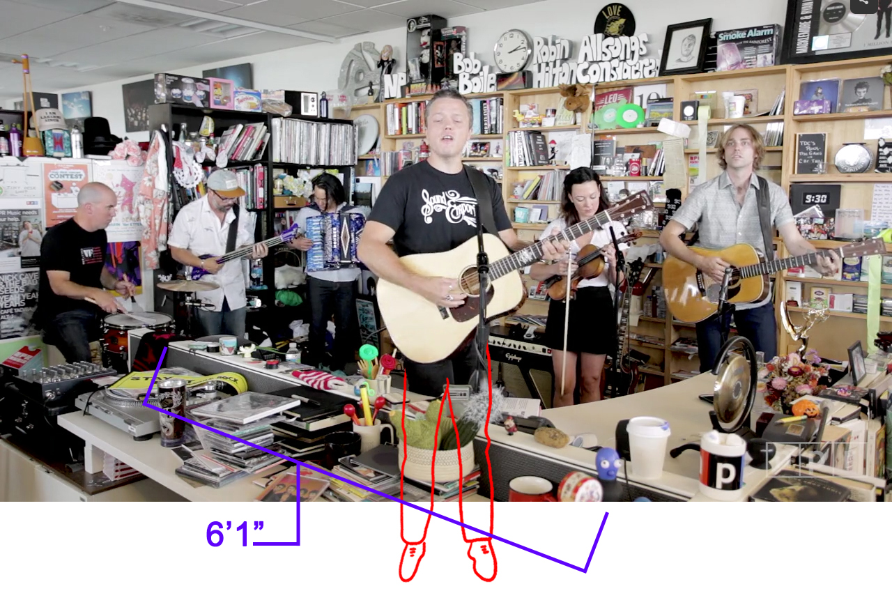 Jason Isbell, who in June of 2016 told a fan on Twitter that he is 6’ 1” tall, performed a Tiny Desk Concert in August of 2017. Assuming Isbell was being truthful about his height (two sources who have met him confirm the approximation), and assuming he did not get any taller in the 14 months between these two events (men typically stop growing in height by the age of 18; Isbell is 39), let’s use his reasonably tall stature as a scale with which to make a rough measurement of the desk.