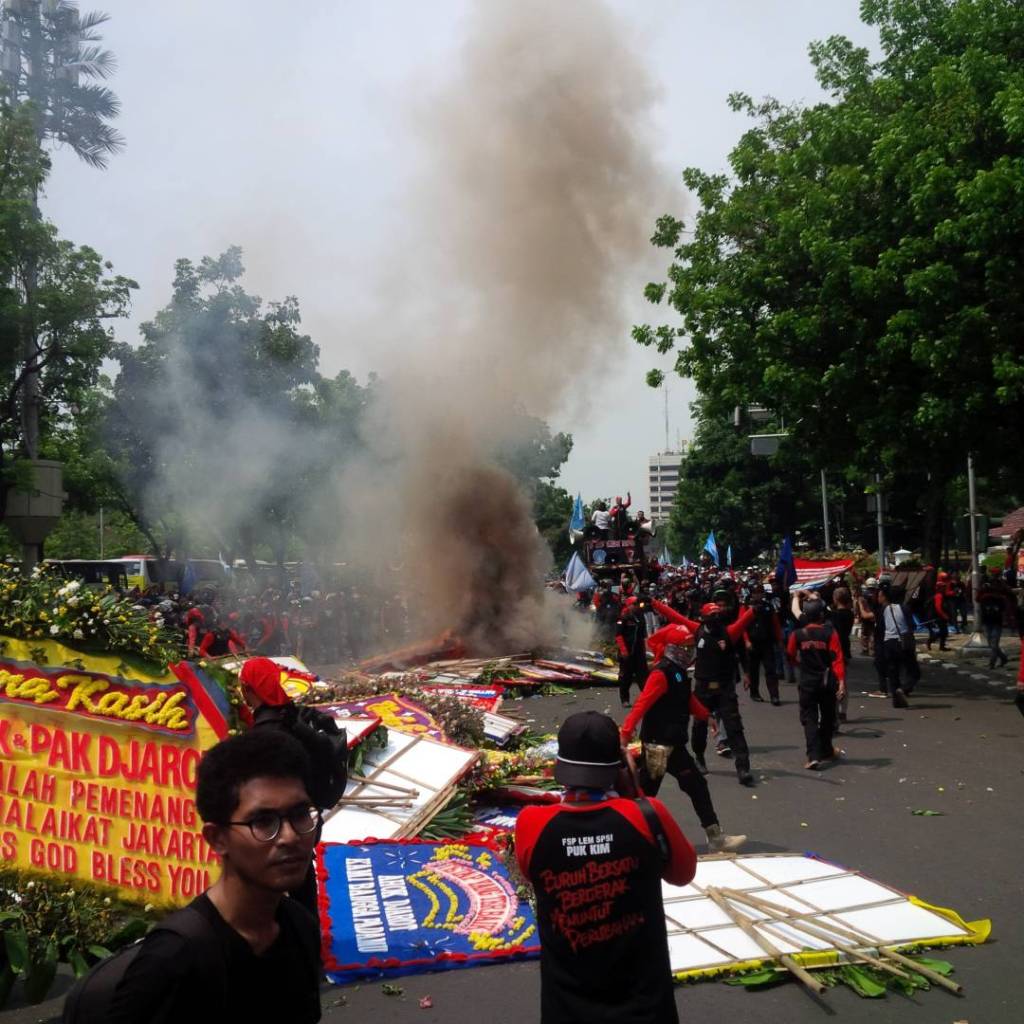 Labor protestors set fire to flower boards thanking ousted governor Basuki Tjahaja Purnama and his running mate for their good work as Jakarta’s massive May Day rally drew to a close Monday afternoon, according to reports in local media.
