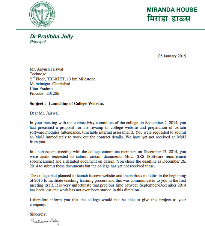 “I wanted to show my customers what they wanted, so I hired three interns in Miranda House. They would ask their teachers what they want, which they would tell me, and I would build that,” he says. The problem was that Jaiswal wasn’t good at creating sophisticated back-end software and filing paperwork. So six months after winning the bid, Miranda House fired him. “I didn’t have money to pay professionals, and had bootstrapped it. That’s when it all went to shit. Everything we had given to the college, like MoUs, were highly unprofessional,” he says, “but it was a seven year contract, so they cancelled it.” He now keeps that email framed in his room.