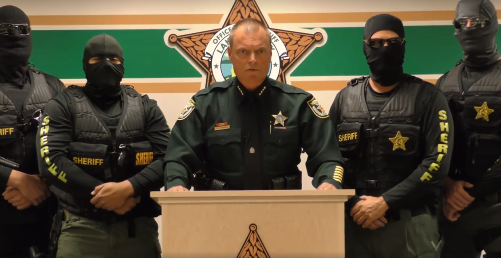 Some Twitter users have compared the clip to an ISIS propaganda video, pointing out that it shares a couple of caliphate trademarks: masked men and threats delivered directly to camera. Others have criticised the Sheriff for presenting an image of a militarised police force. Others, like myself, think it falls somewhere between a paintball arena training video, the Taken monologue and a Tim and Eric skit.