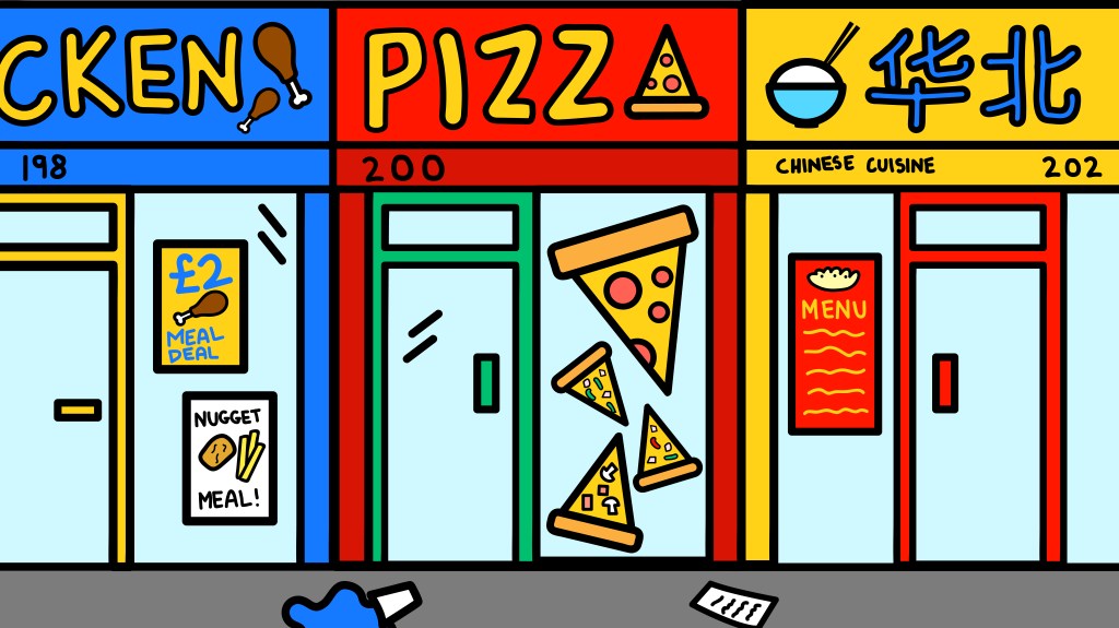 In the 150-metre radius from my flat, there are almost too many to count. Closest is the pizza place on the corner, then the kebab shop a few doors down that stays open until 2 AM and has a torso-sized pillar of rotating meat in its window. In the other direction, there is a Chinese restaurant, a Vietnamese spot, and a handful of chicken shops dotted in between.