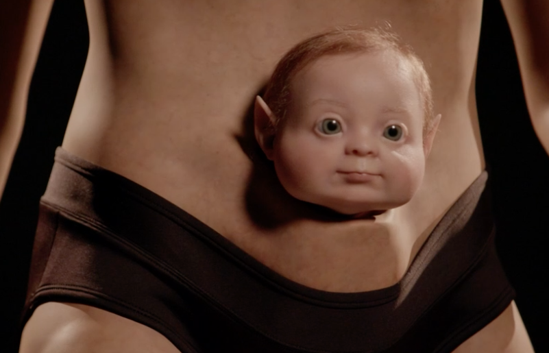 Oh, and a creepy goddamn baby head peers out from a kangaroo pouch on its stomach.