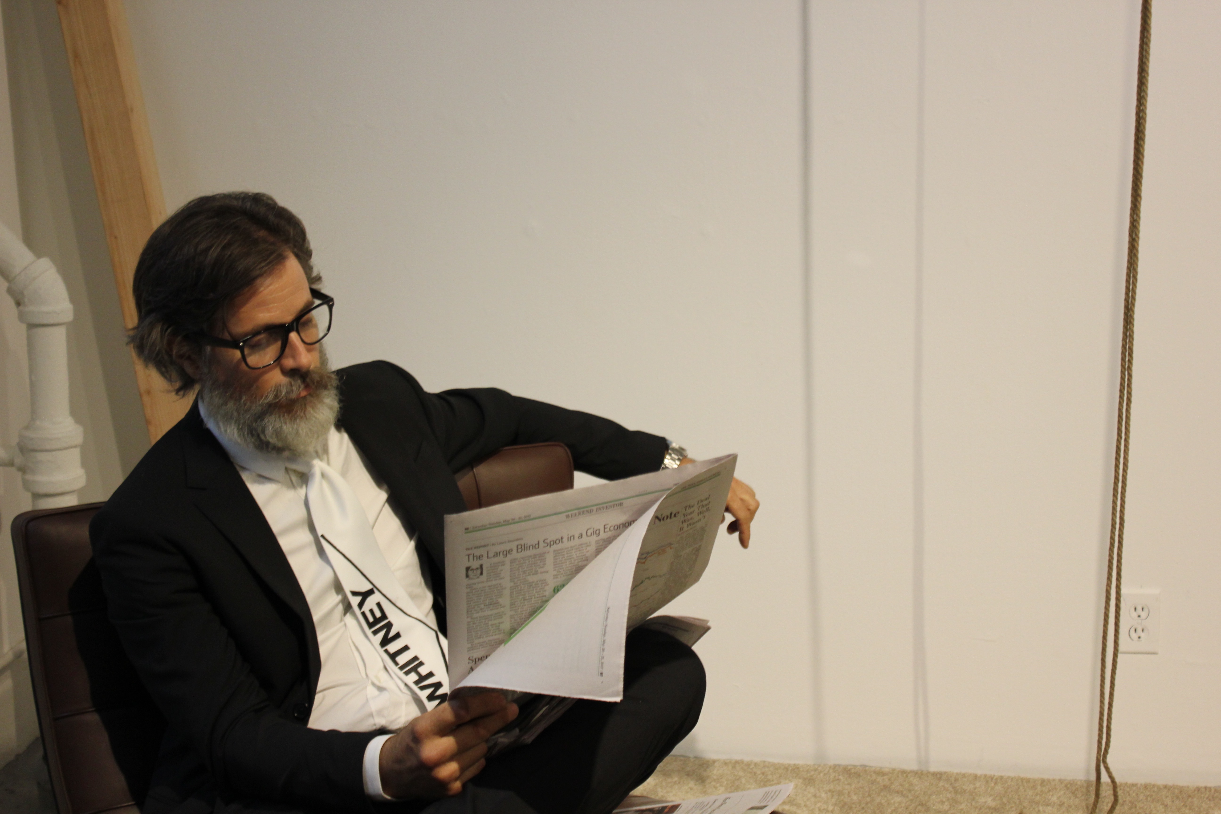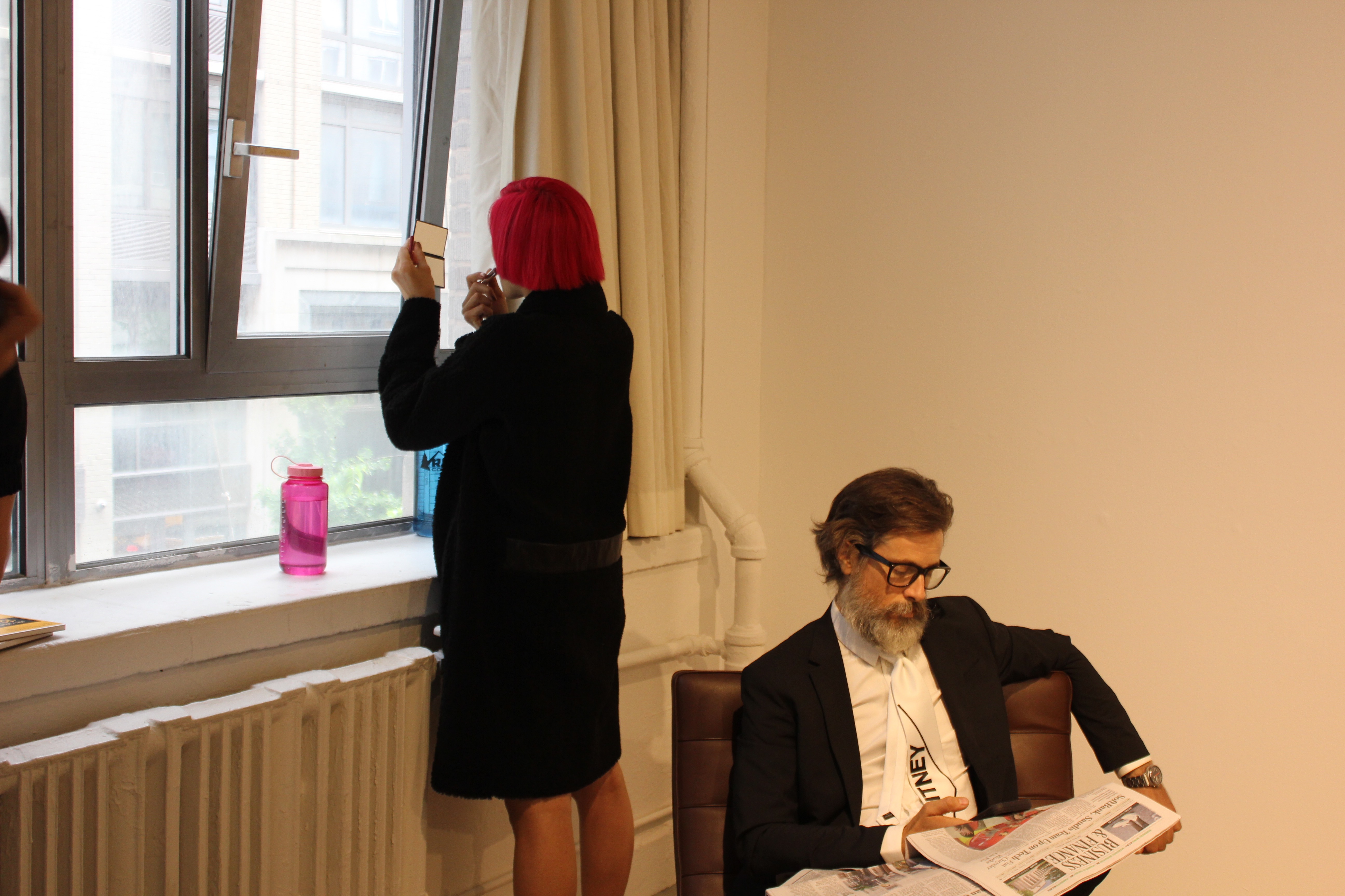 At the Elizabeth Foundation for the Arts Project Space, Sulkowicz’s hair was a bright pink. In the second floor gallery, guests milled around looking at various projections, photographs and documents, and other works of art by Sulkowicz’s peers. But what provoked the most intrigue was Sulkowicz’s tableau: right by the open-bar wine table was a large rug; upon it, a single chair with a seated, bearded man wearing a suit and a tie emblazoned with the Whitney Museum’s logo.
