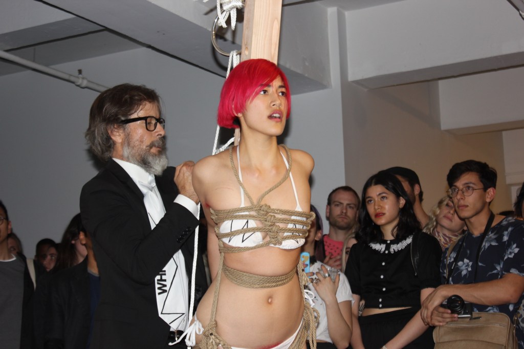 As the performance started, this man in a suit, named Master Avery, started to berate Sulkowicz. “Your boobs are too small,” he spat. “You can’t even stand up straight.” He pulled a long, gnarled rope out of a black leather bag and started tying intricate knots around her upper thigh. Once the knots covered both of Sulkowicz’s legs, Master Avery started around her waist, moving her body as he worked quickly. At one point, the rope almost hit Sulkowicz’s eye. After a few shocked blinks, she looked up at the audience and laughed.