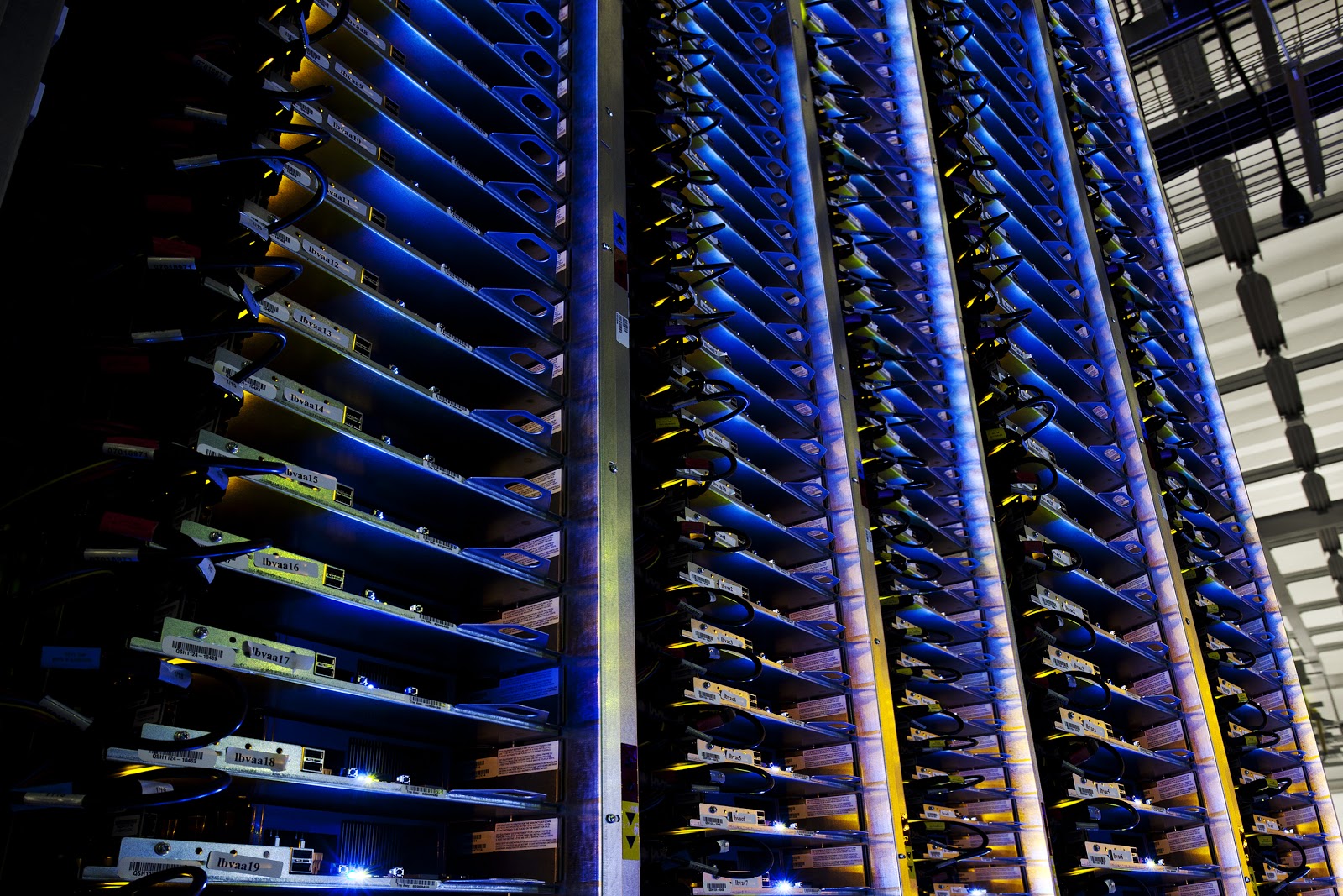 Racks and racks of servers hum away at a Google data centre.