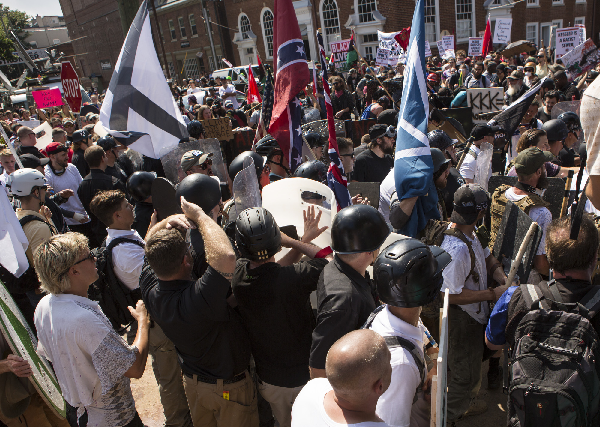A few minutes later, shield-wielding riot cops from the Virginia State Police declared an unlawful protest and cleared the area around the Confederate monument. Protestors on both sides scattered, with the far-right extremists marching more than a mile and across a highway to another park. The Black Lives Matter protestors who opposed them eventually made their way to a strip mall at the center of town.