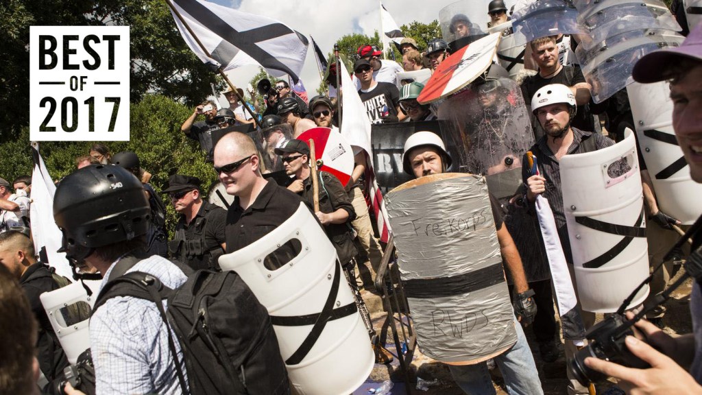 The “Unite the Right” rally dissolved into chaos practically before it began. Around noon, a cornucopia of racists had gathered around a statute of Confederate general Robert E. Lee that was set to be removed, and their opponents surrounded them on the streets below. About 20 minutes before the rally’s scheduled start time of noon, the two sides were already chucking rocks and water bottles at each other. The air was already so filled with pepper spray it tasted like snuff.