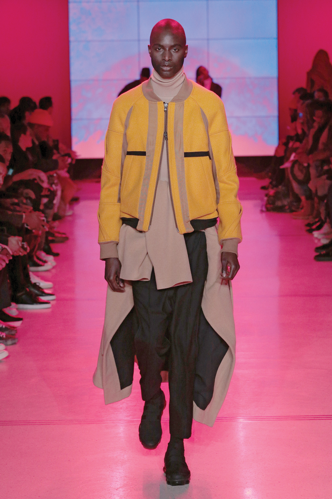 But recently the brand’s relationship with the future has become complicated. Its Spring/Summer 2018 collection, entitled Hyperobject, featured some clothing with aerial images of melting glaciers, highlighting the adverse effects of climate change that have been especially fueled by polluters in the fashion industry. Then their debut runway show for Autumn/Winter 2018 took their critiques of where humans are headed one step further. Appropriately titled Utopia/Dystopia, the color-blocked collection of avant-garde staples was presented at New York Fashion Week: Men’s in February with beautifully haunting music performed by genre-defying singer-songwriter Kelela and Abdul’s brother Tosin, the metal guitarist of Animals as Leaders. As the cacophonous sound tapped into the dubiety of our times, the models walked the runway wearing “geometric facial recognition maps” on their faces—an explicit nod to the troubling and exciting adoption of that technology, just one more example of the devil’s bargain we’re forced to make between convenience and privacy.