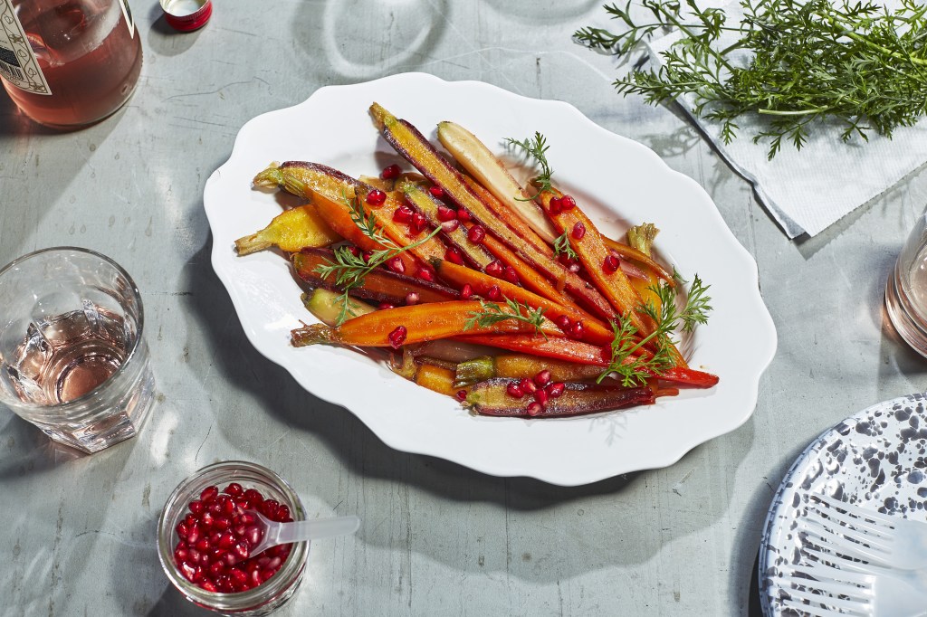 2 pounds|910 grams multicolored carrots, peeled, trimmed, and halved lengthwise, greens washed and reserved