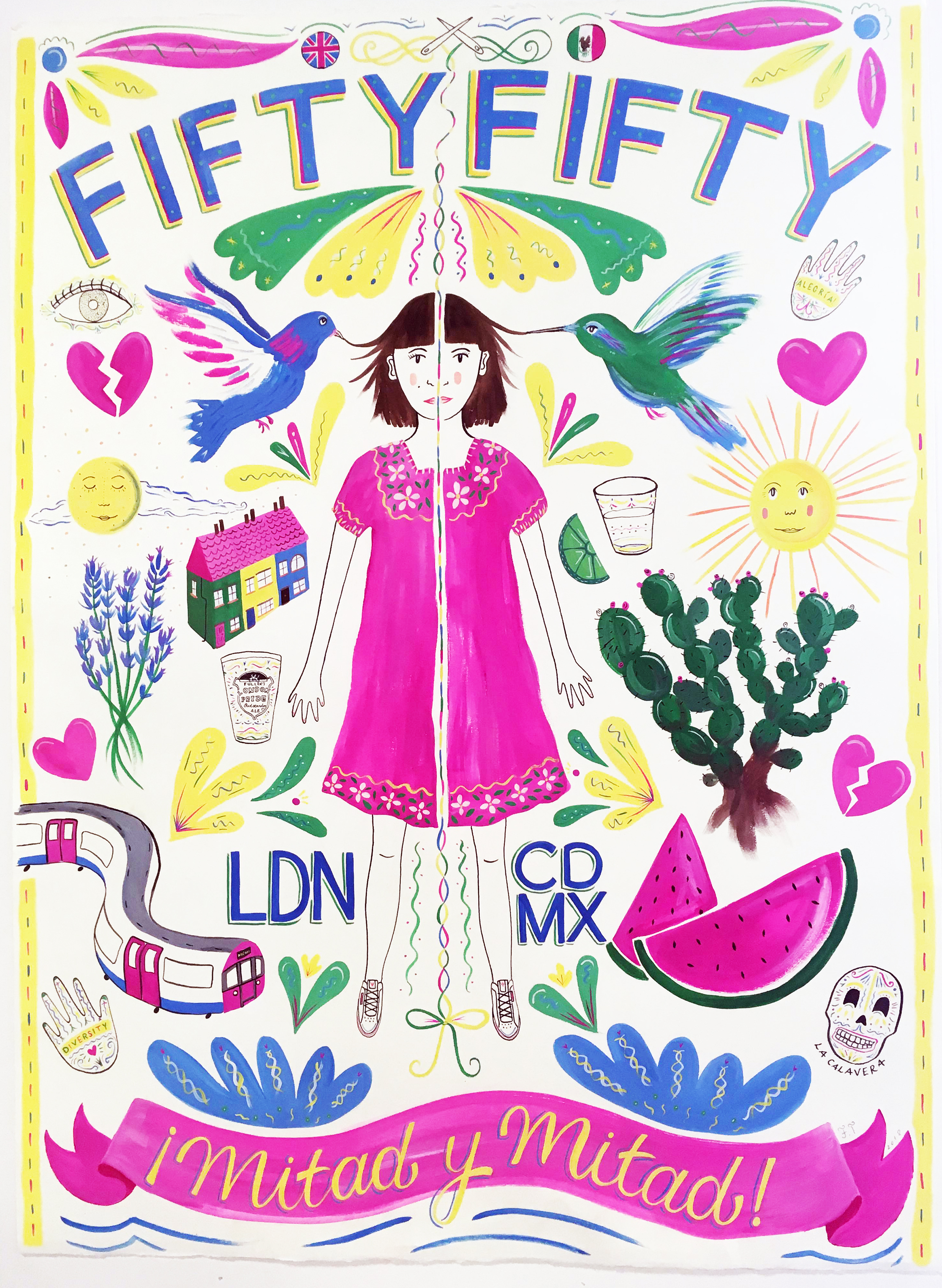 “My work is defined by vibrant colours, playful lettering and decorative patterns. Having spent part of my childhood in Mexico, my piece Fifty, Fifty is greatly influenced by the expressive qualities of Mexico’s folk art and vernacular lettering and exploring my Mexican heritage whilst growing up in Britain.”