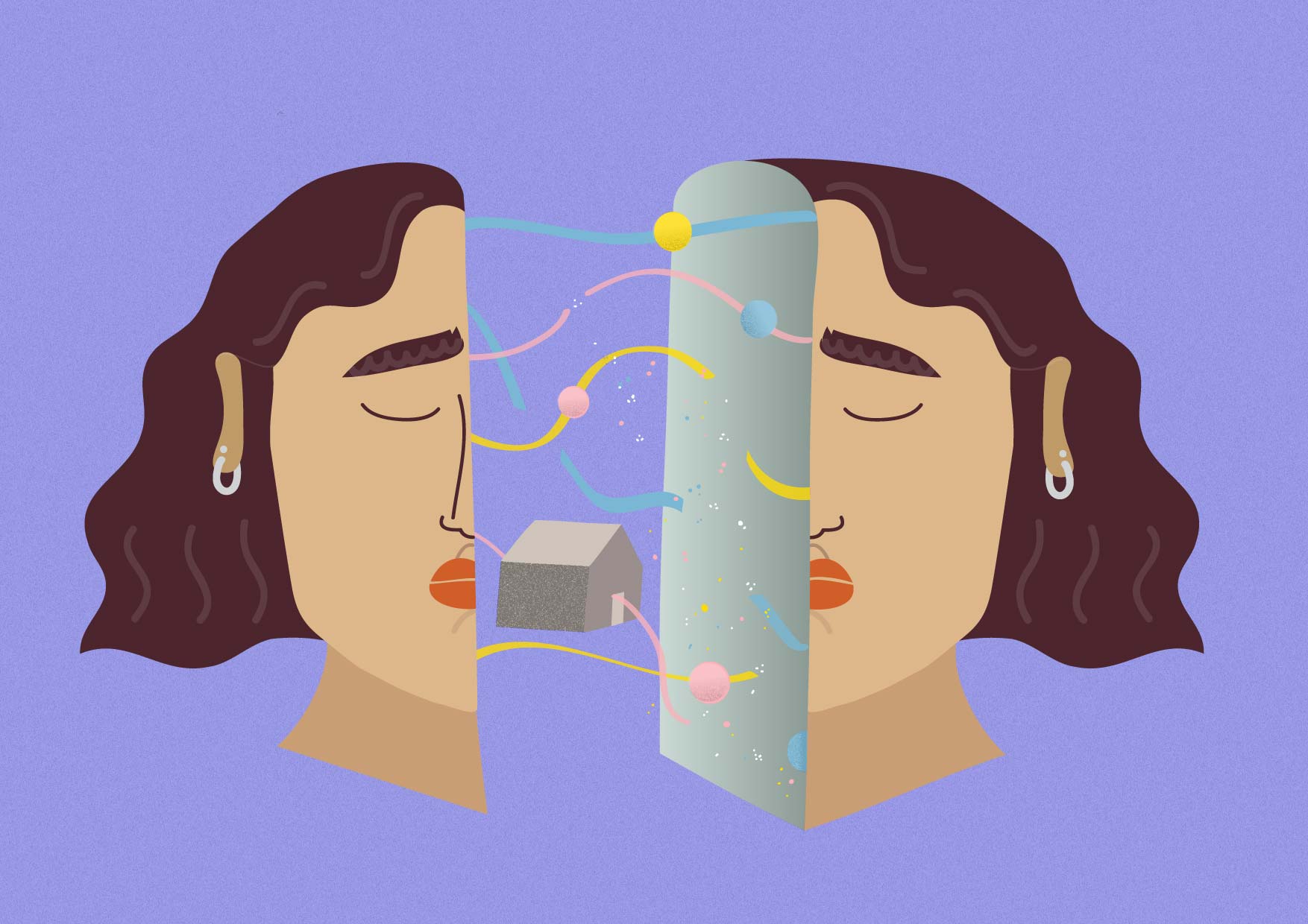 “This Illustration loosely explores the duality of my Turkish and British heritage. Whilst I think there are mostly only positives in coming from two (or more) different cultures, I wanted this piece to focus on the slight feelings of displacement and confusion which can also arise when coming from dual or multiple different backgrounds and cultures—feeling a bit disconnected, especially during your teenage years and early 20s; feelings of nostalgia; not feeling quite ‘whole’ or enough of either culture, and trying to figure out your sense of self, identity, and ‘home.’”