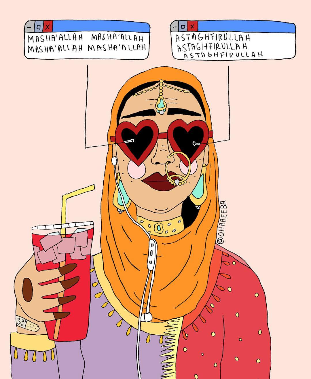 “The image is a visual representation of a modern Muslim woman stuck between the concept of sin and forgiveness. This is how I, as a modern Muslim, go through my day which is usually surrounded by cute guys and things that are blindingly beautiful—but I have to stay strong in my faith.”