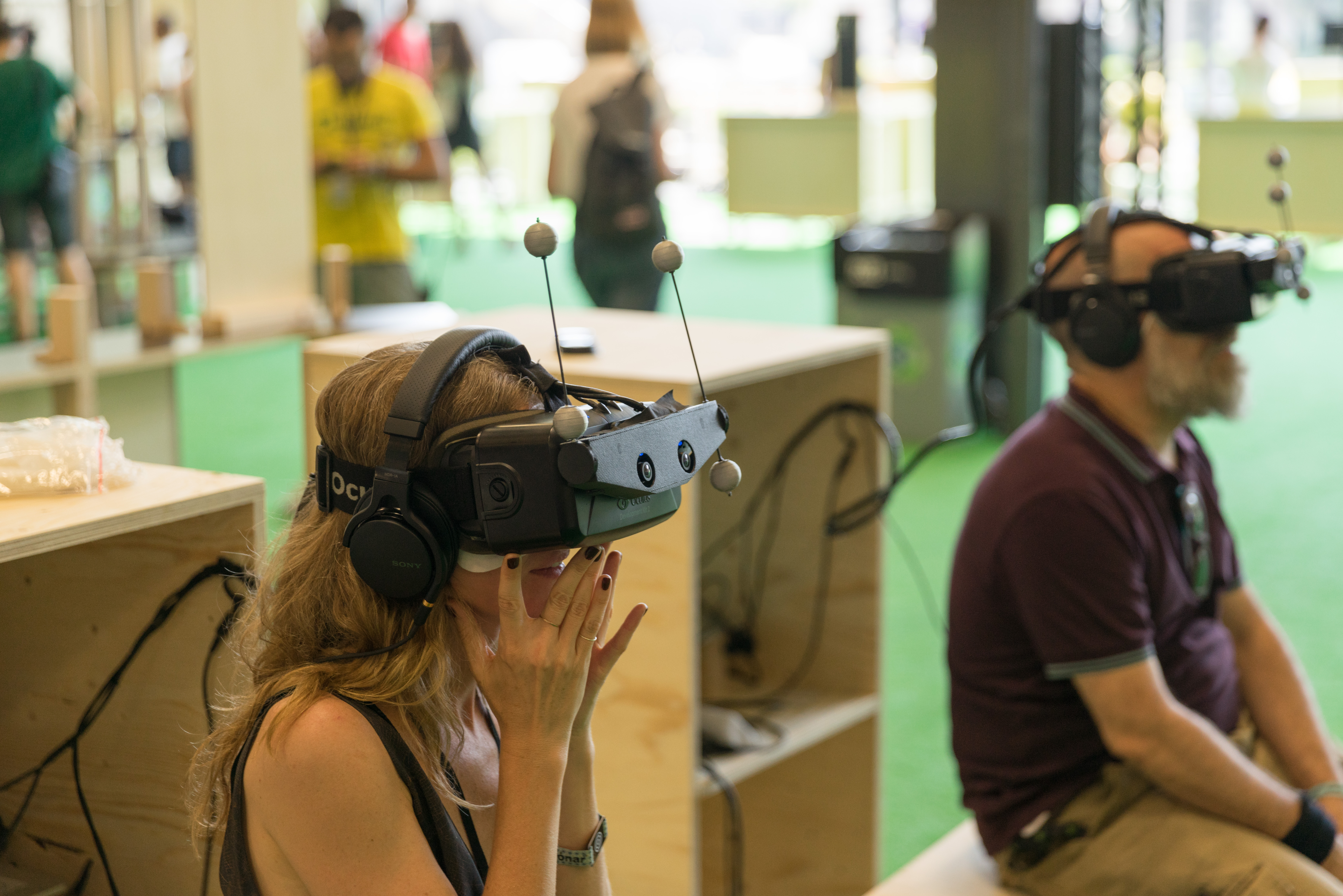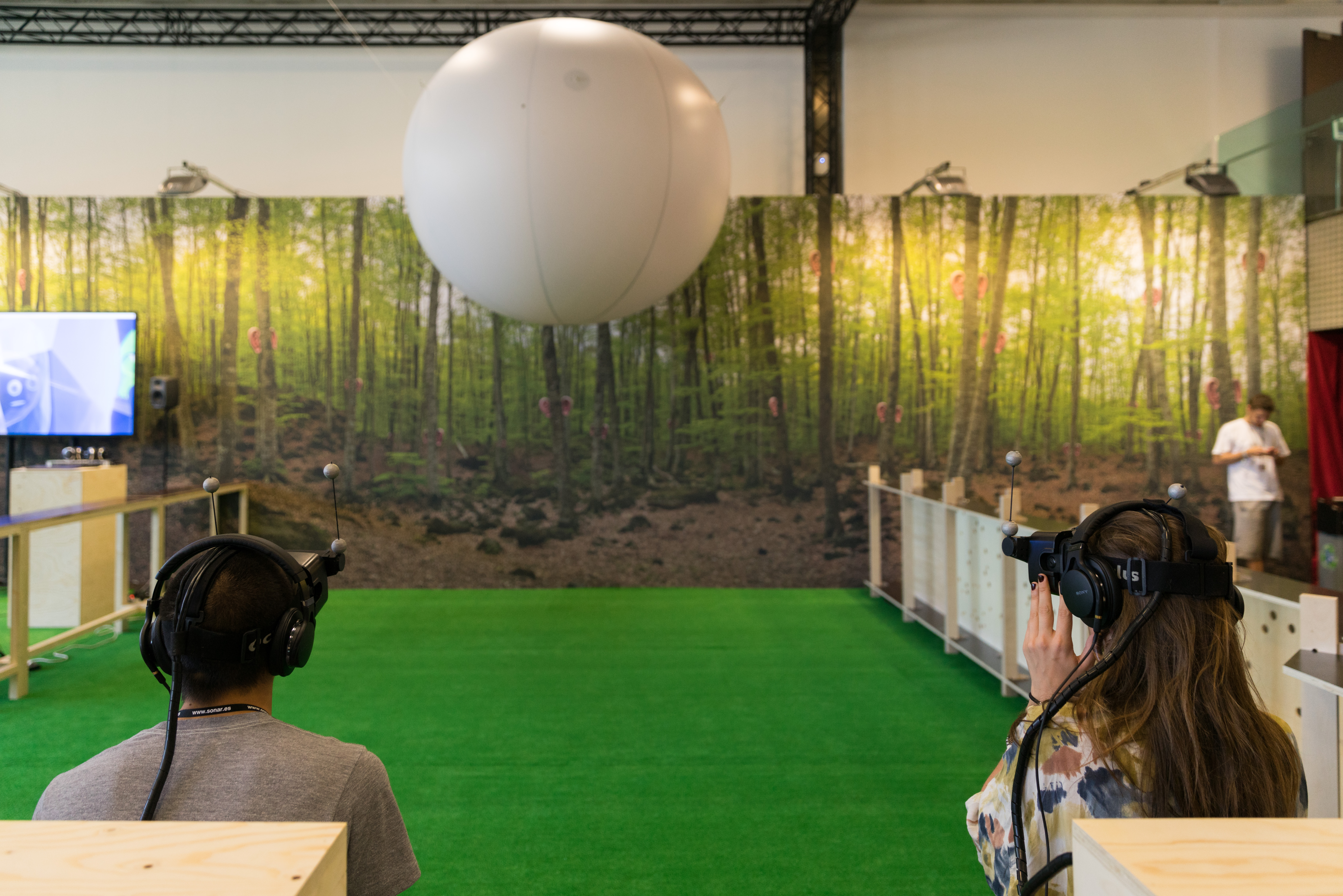 Through Tokyo-based studio Rhizomatiks Research, Manabe has explored projection-mapped dance performance, augmented reality music videos for Nasoj Thing, and avant-garde drone choreography. Recently, Manabe debuted two new installations that explore this territory in new ways. The first, phosphere, which debuted within Sonar+D’s SonarPLANTA space, is a performance that paired dancers with a robotized system of lights, smoke machines, and video projectors. The other work, border, is a virtual reality installation that turned the festival’s Realities+D area into a highly immersive augmented reality experience, in which a giant white sphere suspended from the ceiling digitally mutated with the surrounding space.