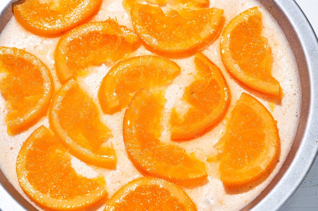 - Finely dice 8 of the orange half-moons and sprinkle over the bottom of the pie crust. Slowly pour the filling into the pie crust and refrigerate until set, at least 4 hours or up to 1 day in advance.