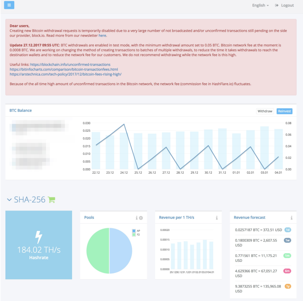 On December 17th 2017, Hashflare (briefly) suspended withdrawals. For a few days, I kept reinvesting simply because it felt like a video game that had cost me five figures than gambling with real money. When Hashflare re-opened withdrawals, I stopped reinvesting and waited for the day when the withdrawal button would turn blue—which ended up being Christmas Day.