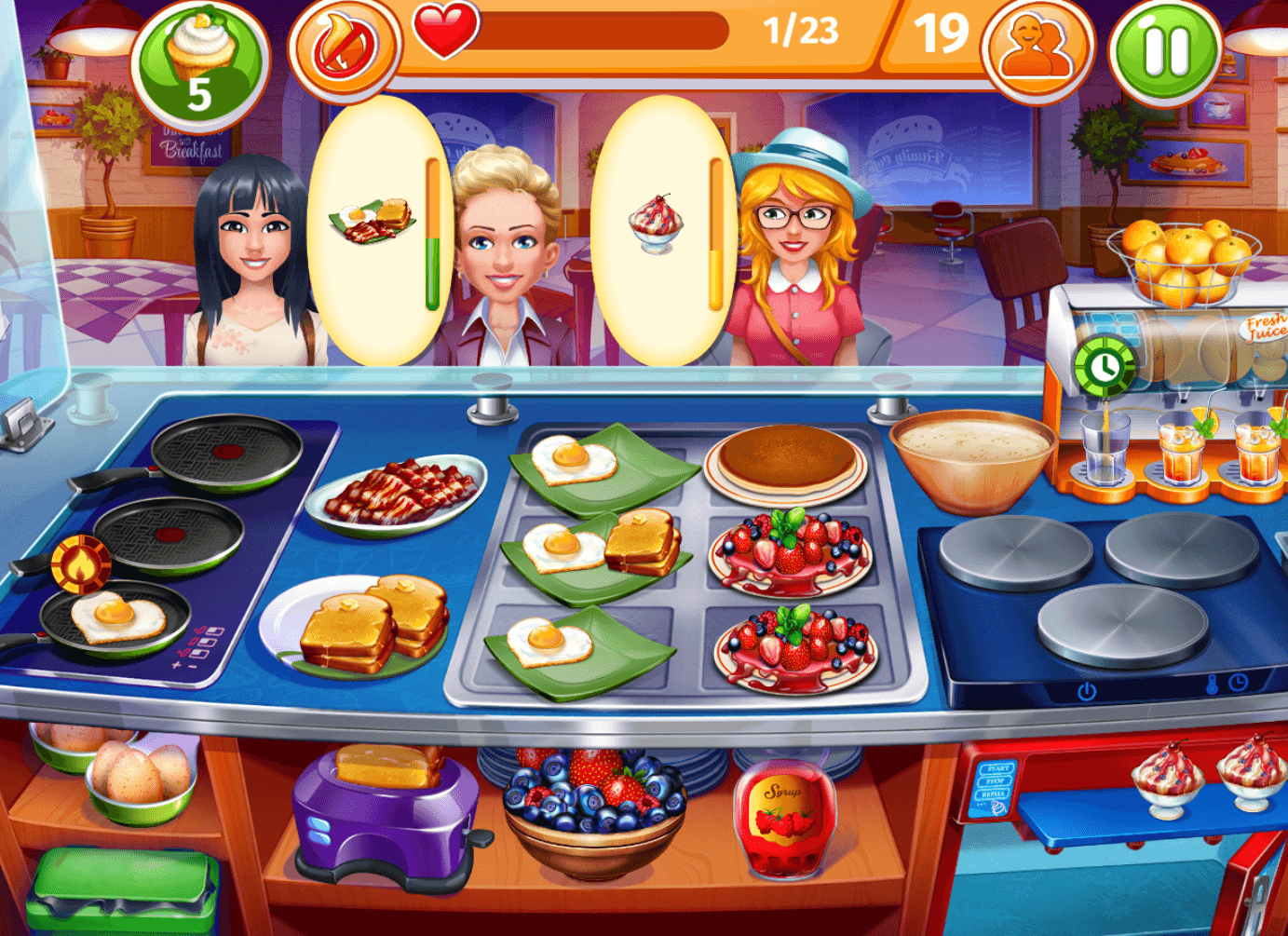 Successfully burning through the game has little to do with your actual kitchen skills, and everything to do with how quickly you are able to juggle cooking, grilling, garnishing, and serving multiple dishes simultaneously (though you can purchase higher quality ingredients and machinery in the game’s store). In some levels, you’re tasked with earning a certain amount of money within a finite amount of time, or serving a specific number of dishes. In others, the difference between winning and losing is not making your customers wait too long—something they will make abundantly clear, by flashing you nasty looks and (literally) turning into animals.