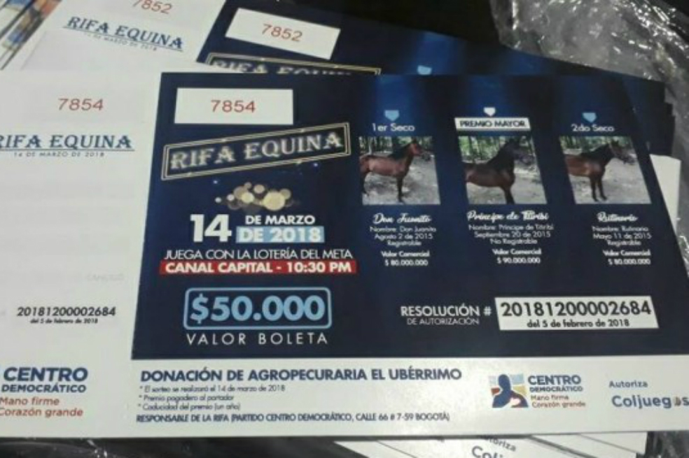 Cada boleta tiene un costo de 50.000 pesos y hay una existencia de 10.000 boletas. Si se venden todas, el CD tendrá un presupuesto adicional de 500 millones de pesos que será distribuido para las campañas del partido en diferentes regiones. Los caballos a rifar son Príncipe de Titiribí —que tiene un costo aproximado de 90 millones de pesos—, Don Juanito y Rutinario, estos dos avaluados en 80 millones de pesos.