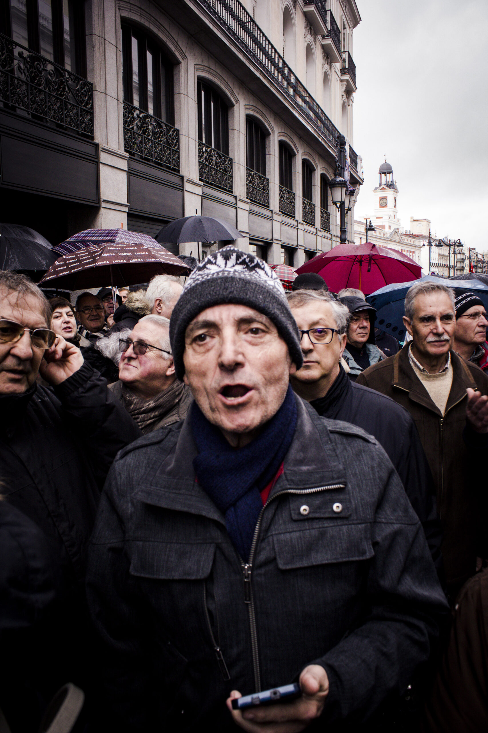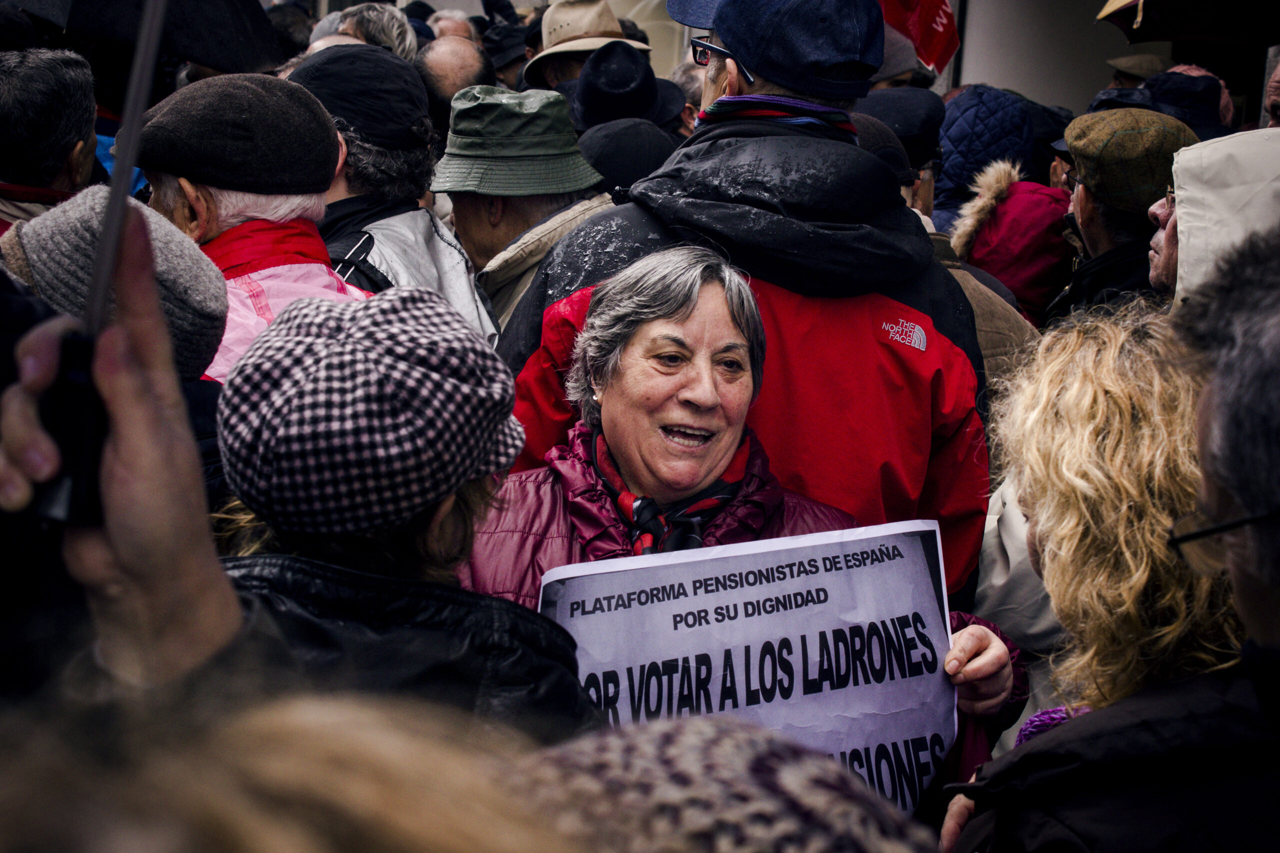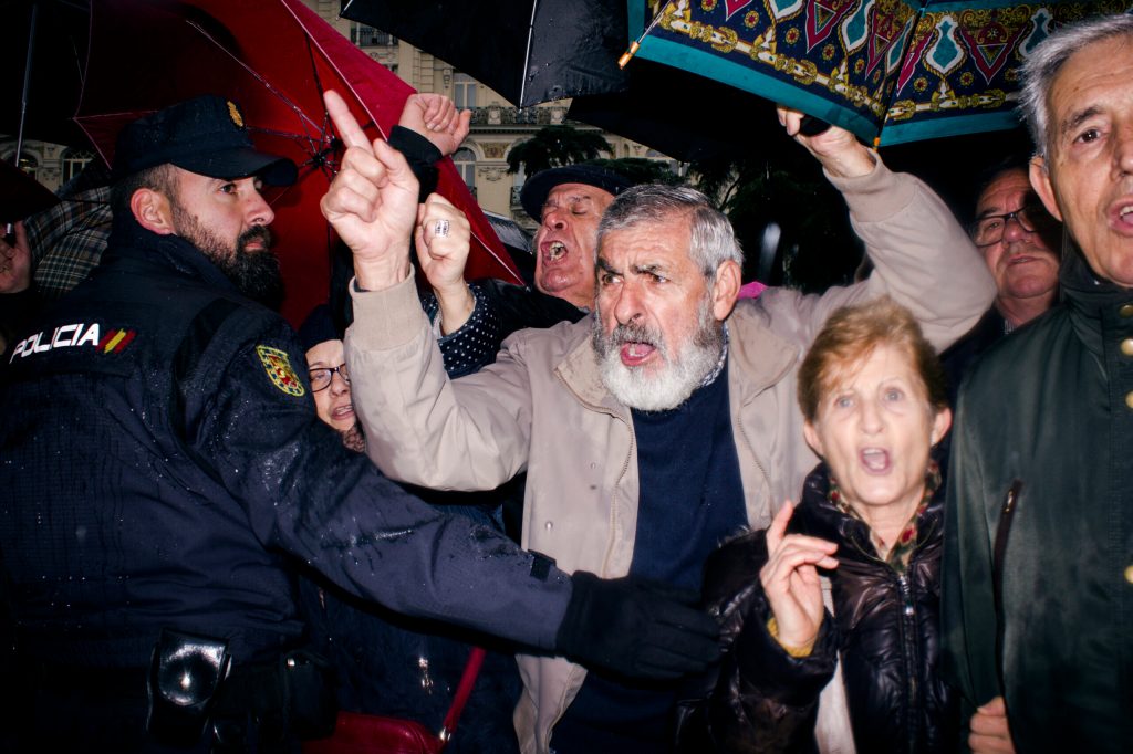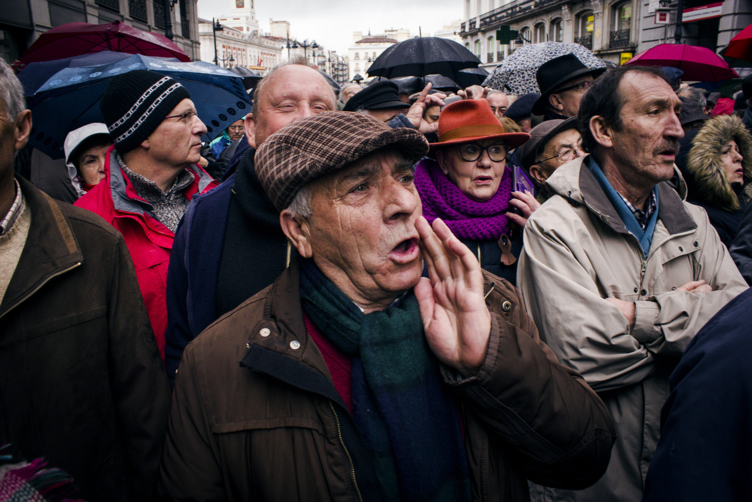 Son las 11 de la mañana y en Madrid la lluvia no ha dado tregua en dos días. La Plaza de Sol empieza a llenarse de gente que grita «Rajoy, dimisión» y «Esto nos pasa por un Gobierno facha». Si cierro los ojos mientras escucho esas consignas casi puedo viajar en el tiempo hasta 2011, cuando en esta misma plaza miles de jóvenes acamparon durante más de un mes. Solo que quienes las pronuncian ahora no son estudiantes, ni jóvenes en paro, ni chavales con trabajos precarios. Son pensionistas. Pensionistas que gritan en el kilómetro cero, pero también en miles de calles y plazas de toda nuestra geografía, a esta misma hora, porque es la única manera que tienen de luchar por sus derechos.