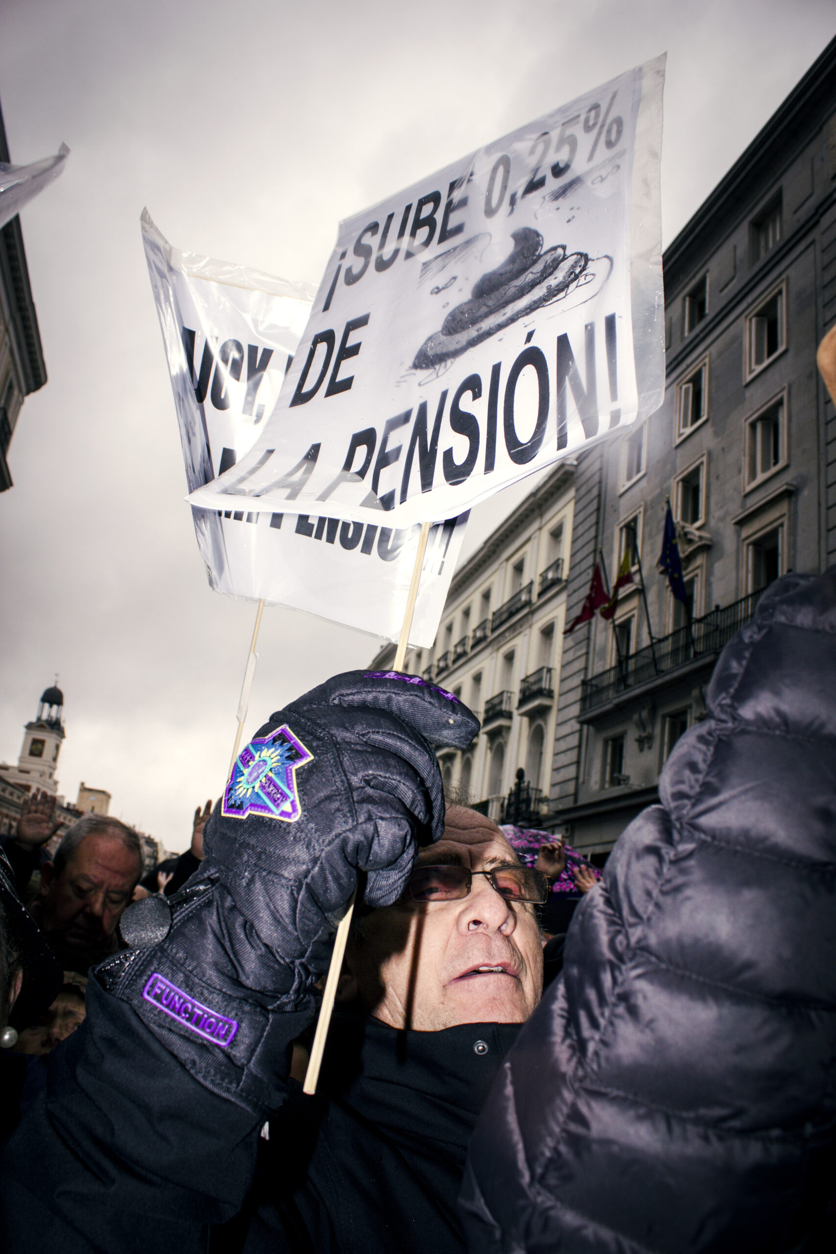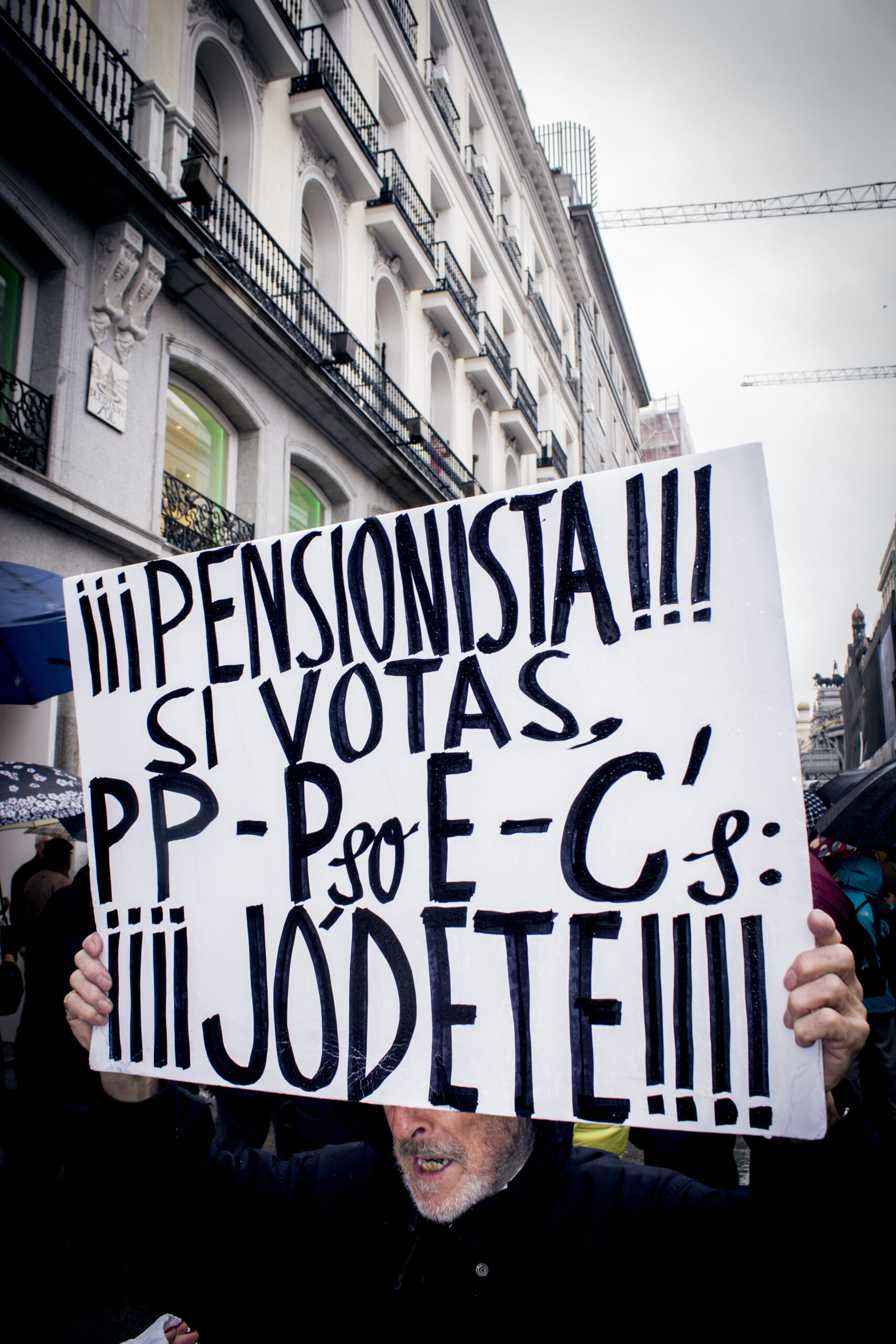 Solo pasan diez minutos de las 11 y Sol se empieza a llenar. Gritan «No nos mires, únete» y el eco retumba en el número 4 de la calle Alcalá, donde tiene su sede el Ministerio de Hacienda. Me acerco a un hombre con el pelo cano que sostiene una pancarta con el mensaje «Pensionista, si votas PP-PSOE-C’S jódete». Le pido que me lo explique.