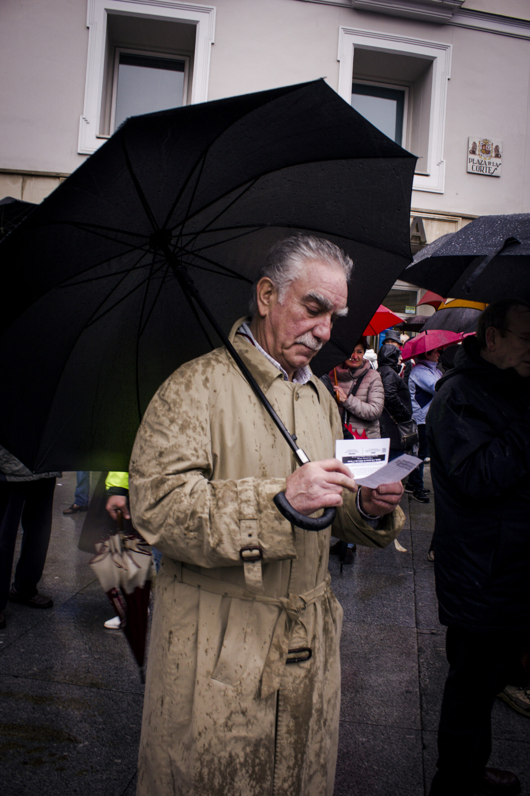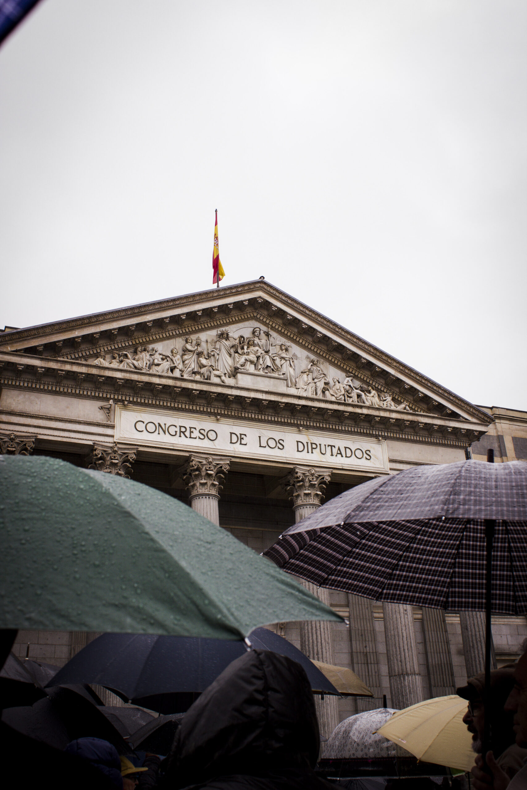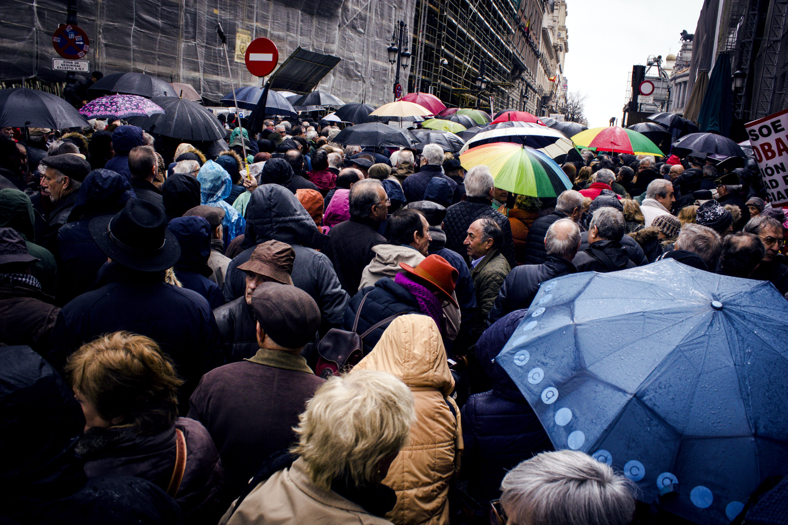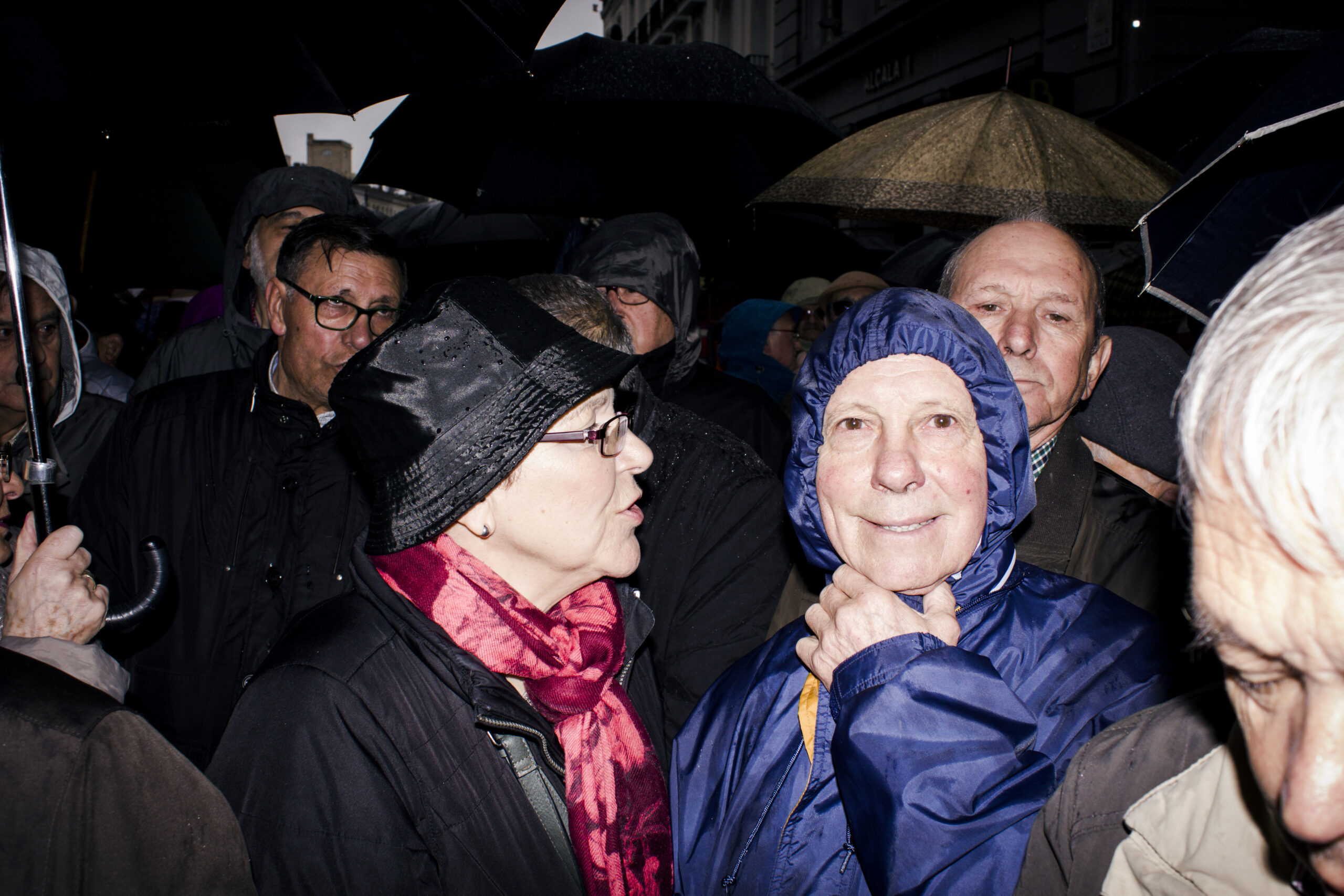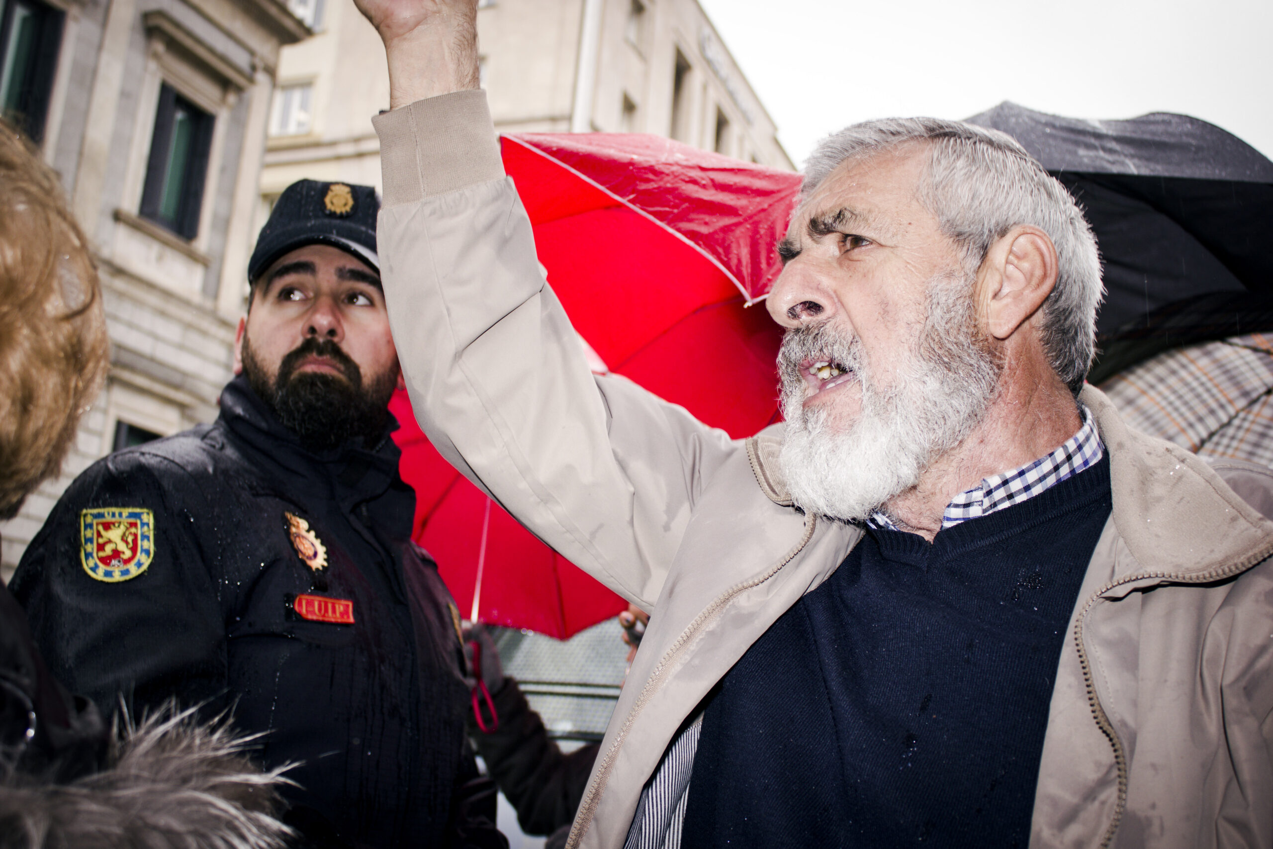 Parece que la manifestación se disuelve al grito de «Sí se puede», los paraguas generan el caos y en Sol no para de llover. Pero, de repente, un grupo empieza a corear «Eso, eso, eso: nos vamos al Congreso». Y cientos de jubilados cortan la calle Floridablanca hasta llegar a las puertas del edificio. Hoy han sido previsores y hay cordón policial. Un señor muy bajito y con el pelo muy blanco le dice a uno de los policías «¿Te puedo poner el paraguas, que llueve mucho?». El agente le responde que no, que no le dejan que haga eso y le sonríe.
