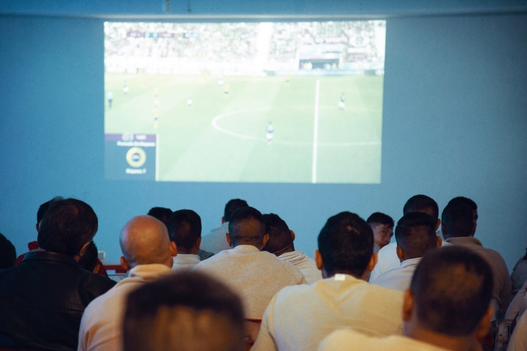 Cada uno de los reos es un universo homogeneizado en sí mismo. Todos tienen tatuajes, cicatrices en la cara y delitos distintos en el historial; pero eso sí, en este momento no hay forma de negar que comparten un par de cosas básicas: a todos los distingue el color beige de su ropa —ya sea en el pantalón, la camisa o el suéter—, y nadie de ellos se atreve a quitarle la vista a la cancha de futbol que el proyector les ha puesto enfrente.