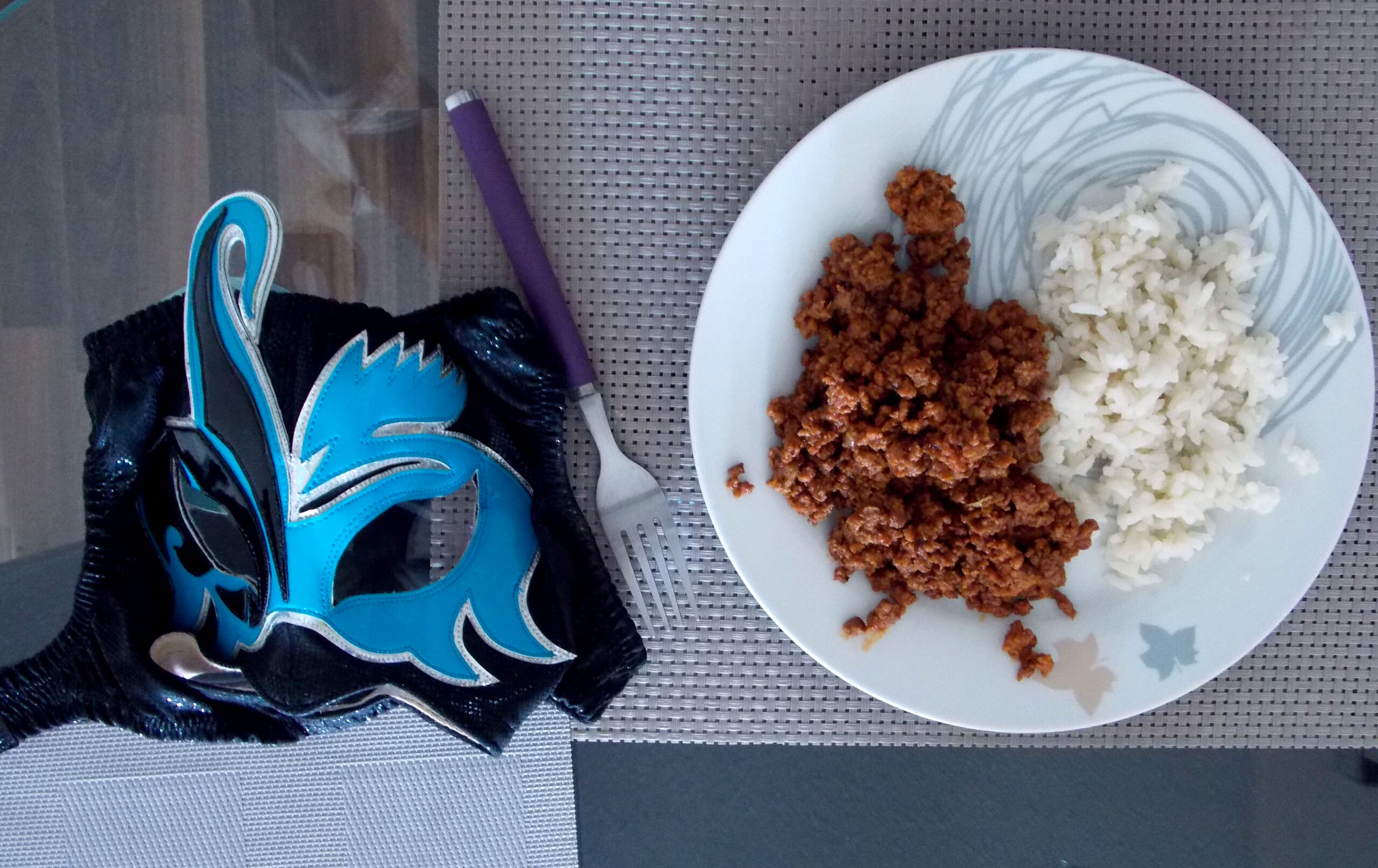 Mientras desayunamos observo que Sanely no puede comer bien, la máscara de luchadora a pesar de estar abierta desde las fosas nasales hasta la barbilla no le permite abrir la boca de forma adecuada. La tela opone resistencia. Por esa razón «El Santo», el legendario Enmascarado de Plata, mandó a hacer una máscara para comer, pues la suya sólo dejaba expuestos los labios. Lo mismo le pasaba a «Mano Negra», que difícilmente podía tomar un simple vaso de agua.