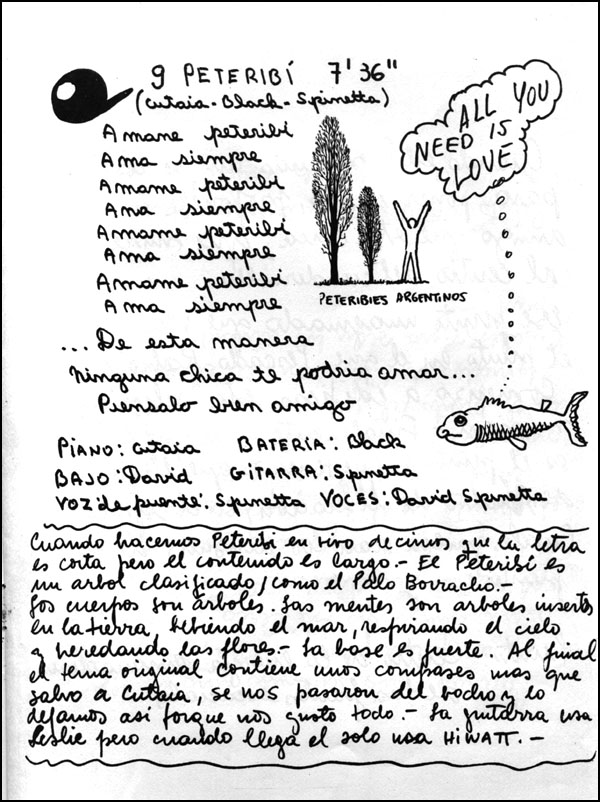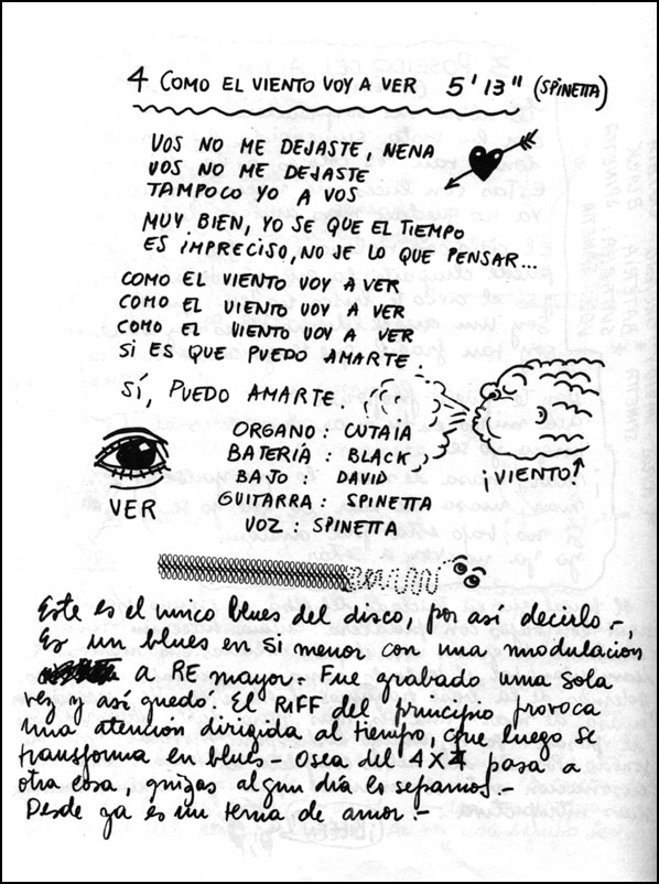 Y hasta ahí, al menos para la mayoría del público local, llega el Spinetta visual. Pero así como Luis era un músico que parecía no parar de hacer canciones, tampoco detuvo su vuelo como dibujante. Aquí el booklet de Pescado 2, segundo álbum de Pescado Rabioso, muestra las canciones de la banda (también) desde la ilustración.