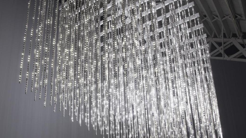 El espectáculo abrió con Cloud Drawings del artista, filas mínimas montadas en la pared de LED verticales, que recuerdan a The Bay Lights, la toma masiva del puente Bay Bridge de San Francisco. En una habitación contigua colgó Ellipse, una serie de cientos de varillas de acero inoxidable suspendidas del techo, que gotean con luz como estalactitas celestiales. Alrededor de una esquina, en una galería oscura, las pantallas 4K y las proyecciones envolventes muestran fascinantes puntos de luz de luminiscencia arremolinada que bien podrían ser galaxias explotando cuando las partículas colisionan.