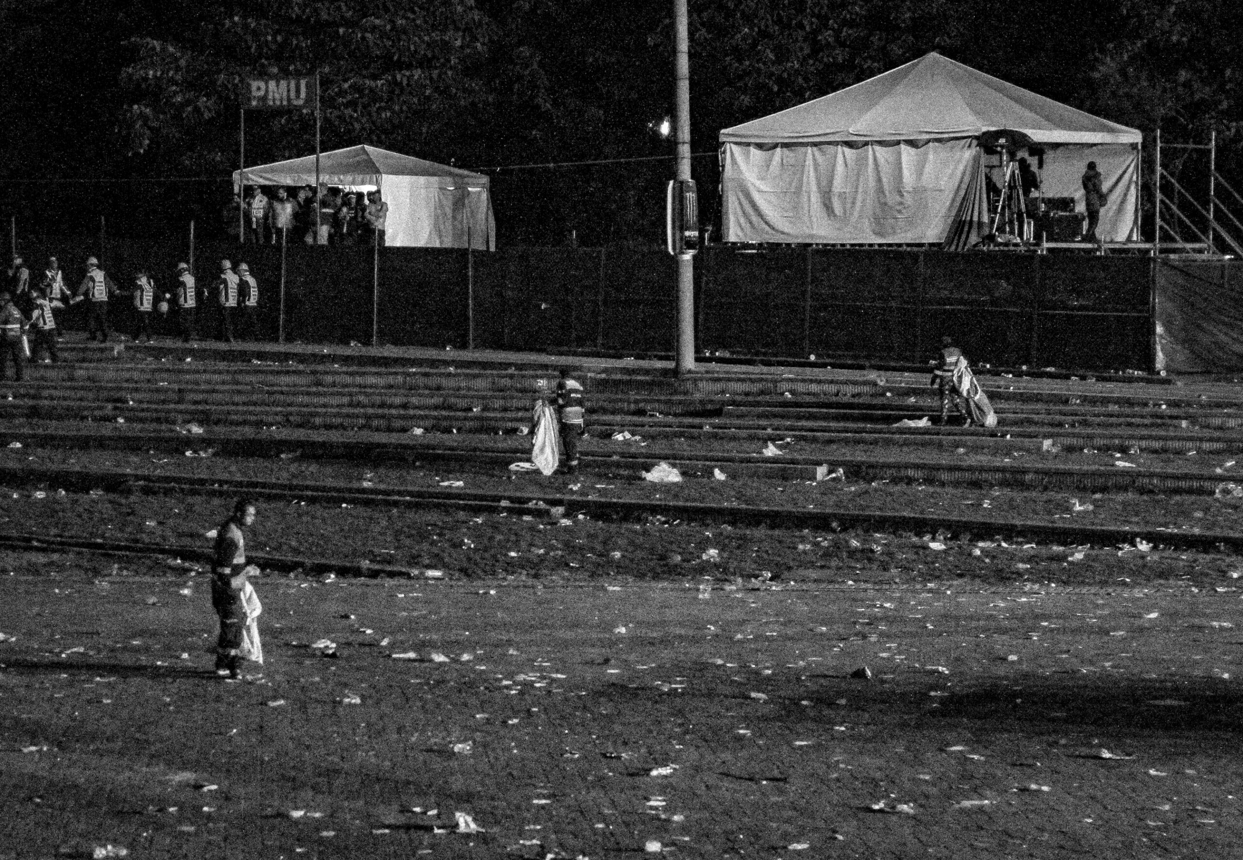 La parte dura le toca al turno nocturno: la cadena humana de chaquetas fosforescentes que evacúa el parque. Ahí emerge la gente de limpieza, y con rastrillos, escobas y sopletes comienza su labor. Me acerco a un hombre flaco de gafas que barre el pasto lleno de colillas de la gradas. Lo hace con evidente entusiasmo y me saluda amablemente. Dice que le gusta trabajar de noche porque puede concentrarse «para dejar esto sin un solo papel». Le pregunto qué es lo más duro de su trabajo, y me dice que nada. Disfruta lo que hace porque ama limpiar su ciudad.