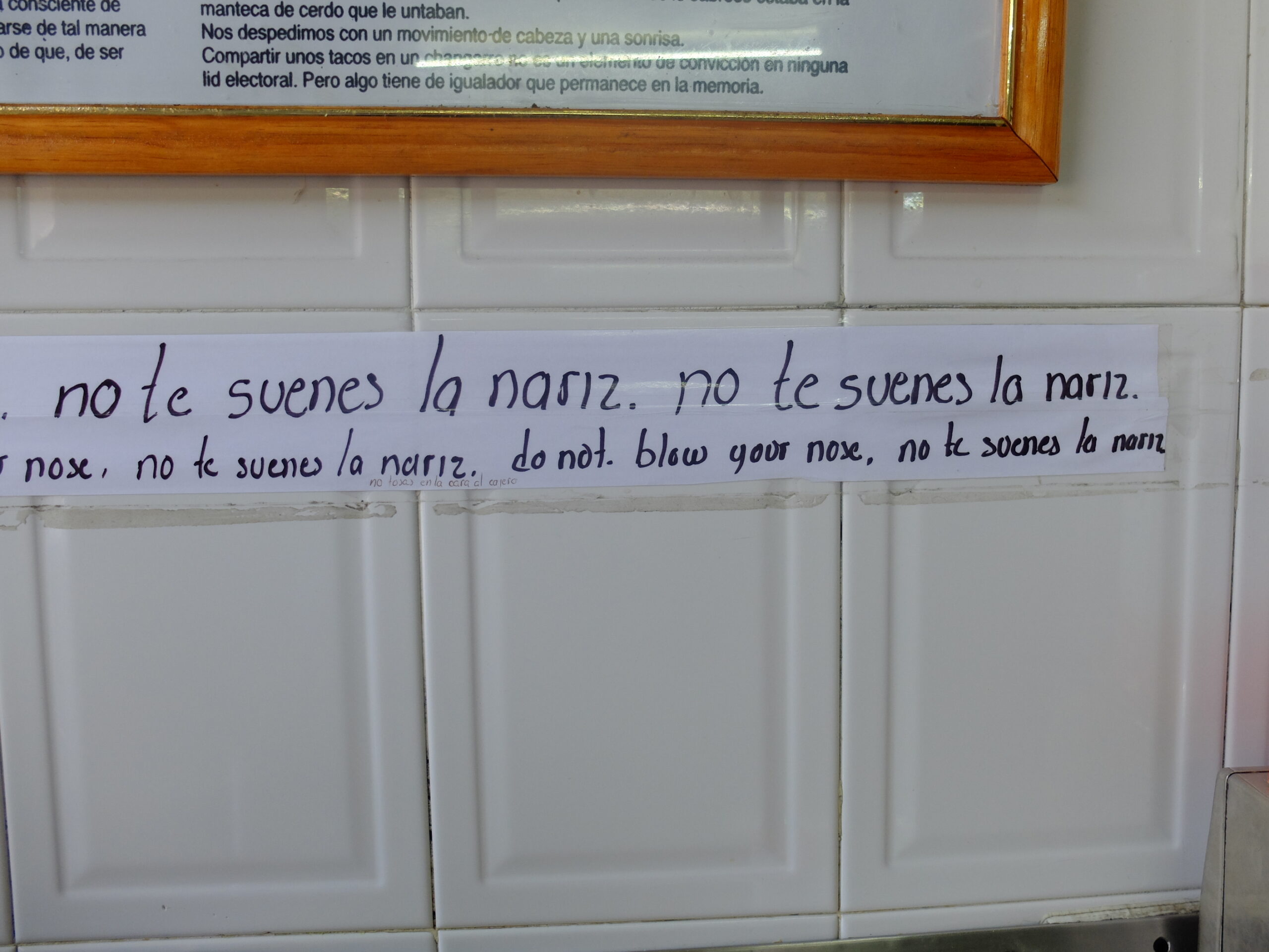 Acercamiento al letrero que pide a los comensales que no se suenen al interior de la taquería: «No te suenes las nariz».