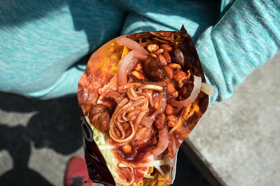 La botana popular: Dorilocos, hechos con Doritos y mezclados, dentro de su bolsa, con zanahoria, jícama y pepino frescos rallados, cacahuates japoneses, limón, salsa Valentina y Miguelito en polvo.