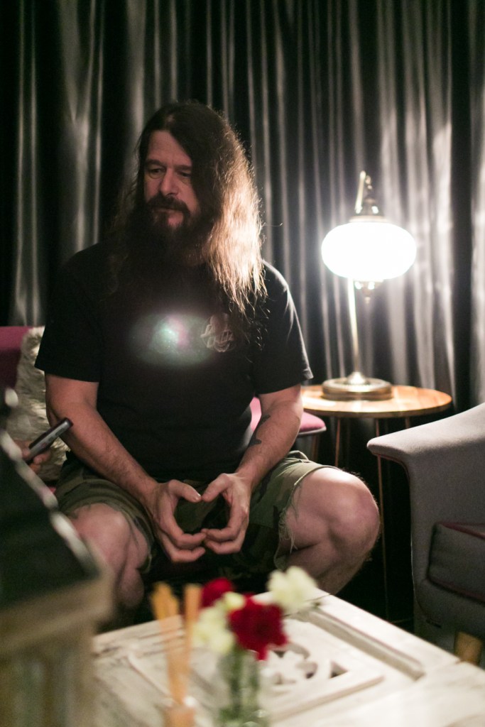Después de pasar varios filtros de seguridad y un enojado y agresivo manager, me senté en una elegante sala del backstage a conversar un rato con Bostaph. El hombre alto, flaco, de mirada profunda y ojos azules es una persona muy tranquila. Se expresa con calma y seriedad y se nota que es alguien a quien que le gusta hablar. Lo malo es que el tiempo es corto y solo pudimos conversar unos minutos de su experiencia como baterísta de tres colosos del metal, el proceso de hacer Repentless sin Jeff Hanneman, su pasión por el fútbol y el futuro de Slayer.