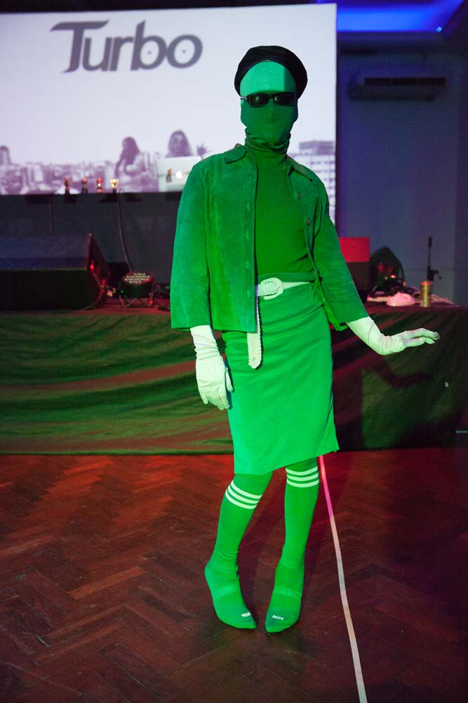 La primera categoría de la noche es runway. Fran camina dentro de su funda y sobre taquitos de charol blanco. Entre los otros participantes están Fabri Obregón, a.k.a Chaco, ganador de runway y voguing en la edición anterior. Está de verde prácticamente de pies a cabeza. Sus tacos también están cubiertos de medias y su cara por una máscara. “La máscara la hice yo. No sabía coser, no me salía al principio”. Fabri trabaja en atención al cliente de una tarjeta de crédito y se acaba de mudar a Capital desde Zona Sur. Acerca de la concepción de su look abortero, explicó “sacás inspiración de todos lados, ya sea de figuras como James St. James y los clubkids o de una marca de ropa. Vetements había hecho una producción con una chica que tenía toda la cara cubierta. Me llamó mucho la atención y dije: me encanta, quiero hacerlo”. Dedicó tres noches a coser la máscara a mano.