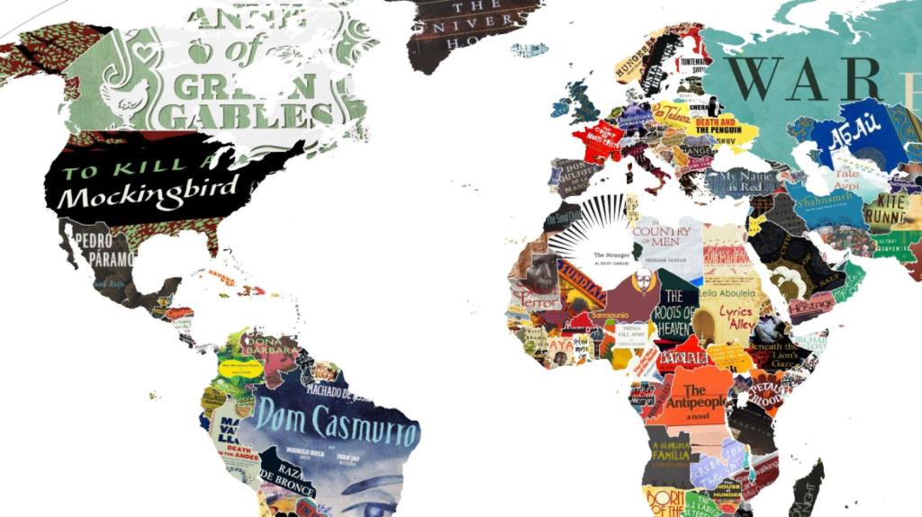 Ahora, bajo el peligro de pecar de subjetividad, observa dos mapas mundiales que hacen referencia a la obra más importante o, al menos, más internacional de cada país del mundo. En el primer caso, puedes ver en un mapa ilustrado y rellenado con la portada y título de la obra en cuestión, gracias al muy respetable esfuerzo del usuario de Reddit Backforward24. Solo por mencionar algunas, nombraré 3 por continente o región, pero puedes ver la lista completa aquí. Si quieres ver el mapa ampliado, haz click aquí.