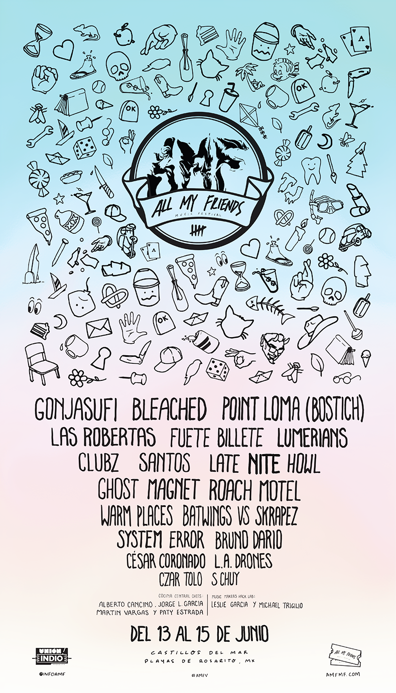 Después de cinco años, el Festival All My Friends cambia, y esto es, en resumen, todo lo que tienes que saber.Lo cual hace que esté aún más chingón, porque ¿qué mejor que ver bandas tan chingonas como Gonjasufi, Bleached y Las Robertas, entre otras bandas, mientras estás echando una chela y un toque en la playa?Además de las bandas, el All My Friends tendrá dos eventos paralelos: #CocinaCentral, en el que algunos de los mejores chefs bajacalifornianos darán una muestra de lo que son capaces en un evento culinario, y el Music Makers Hack Lab, que los organizadores del festival describen como "un laboratorio creativo de convocatoria abierta que permite a los participantes compartir ideas y explorar juntos nuevas posibilidades de generar y controlar sonido electrónico. El laboratorio busca desarrolladores de hardware/software, makers, músicos, compositores, diseñadores interactivos, artistas y cualquier interesado en los procesos de creación Do It With Others de la música electrónica".Como en años anteriores, el precio del festival es increíblemente económico: $150 pesos en preventa y $250 en taquilla. Además, los organizadores ofrecen tarifas especiales en el hotel sede, Castillos del Mar, y en uno alterno, Hotel Corona.All My Friends se llevará a cabo del 13 al 15 de junio en el hotel Castillos del Mar, en la playa de Rosarito, Baja California. Puedes comprar tus boletos aquí, obtener más información del festival aquí, y puedes ver el cartel completo a continuación.