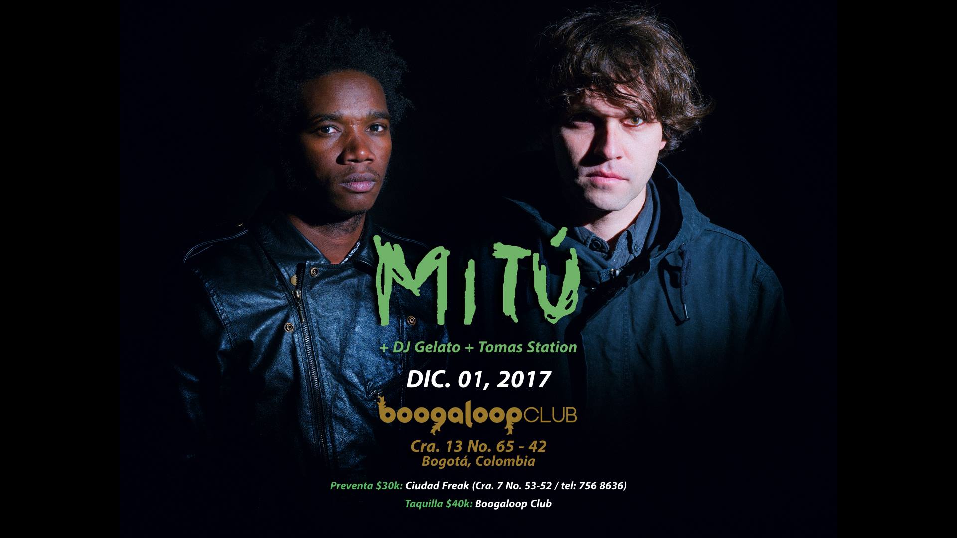 - MITÚ en Booogaloop / Cosmus Tour: Nada mejor que iniciar el ultimo mes del año con una de las duplas de la electrónica latinoamericana más infecciosas. Mitú, íntimo en uno de los sitios más importantes de la escena local, estará presentando Cosmus, sin duda uno de los discos más increíbles de este 2017. De obligatoria existencia.