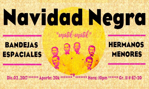 - Navidad Negra: Noche de experimentos sonoros en el epicentro de los experimentos musicales de la capital. Por un lado, Los hermanos menores llegan a matik para romperla con sus jugueteos musicales: mezclas con fundamentos del ambient, el noise y el dron, que coquetean con el rock y el punk. Por el otro, Bandejas Espaciales aterriza con su tropicalia para enfarrar hasta al más escéptico con su compromiso tropical. Caigan.