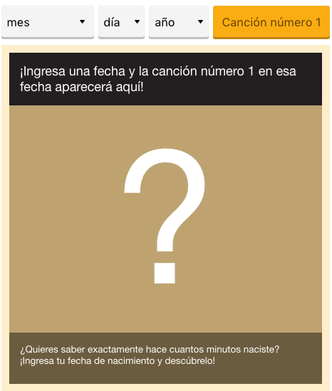 La idea es la misma en otra de las herramientas de la página que le muestran la canción más popular para la misma fecha. Puede subirle el ánimo el hecho de que cuando usted nació estaba de moda Black or White de Michael Jackson, o uno de los hits de UB40, así no haya salido de su casa en una semana y siga en pijama a las 6 de la tarde. Y tiene un bonus: una vez que le muestra la canción le ofrece la posibilidad de saber cuál era la canción de moda nueve meses antes, cuando sus papás lo estaban concibiendo. Ya es su decisión si quiere llegar tan lejos.