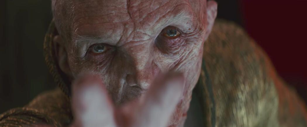 La única vez que el Líder Supremo Snoke hizo su aparición, en El despertar de la Fuerza, lo hizo como un gigantesco holograma azul. Ahora finalmente podemos verlo en carne y hueso y apreciar su increíble palidez, que compite con la de Palpatine. A ambos les iría bien pasar una temporada dorando la piel bajo los dos soles de Tatooine. Luego están sus ojos: no sabemos si tiene problemas con la percepción de la profundidad o esa mirada alberga un gran poder de la Fuerza Oscura.