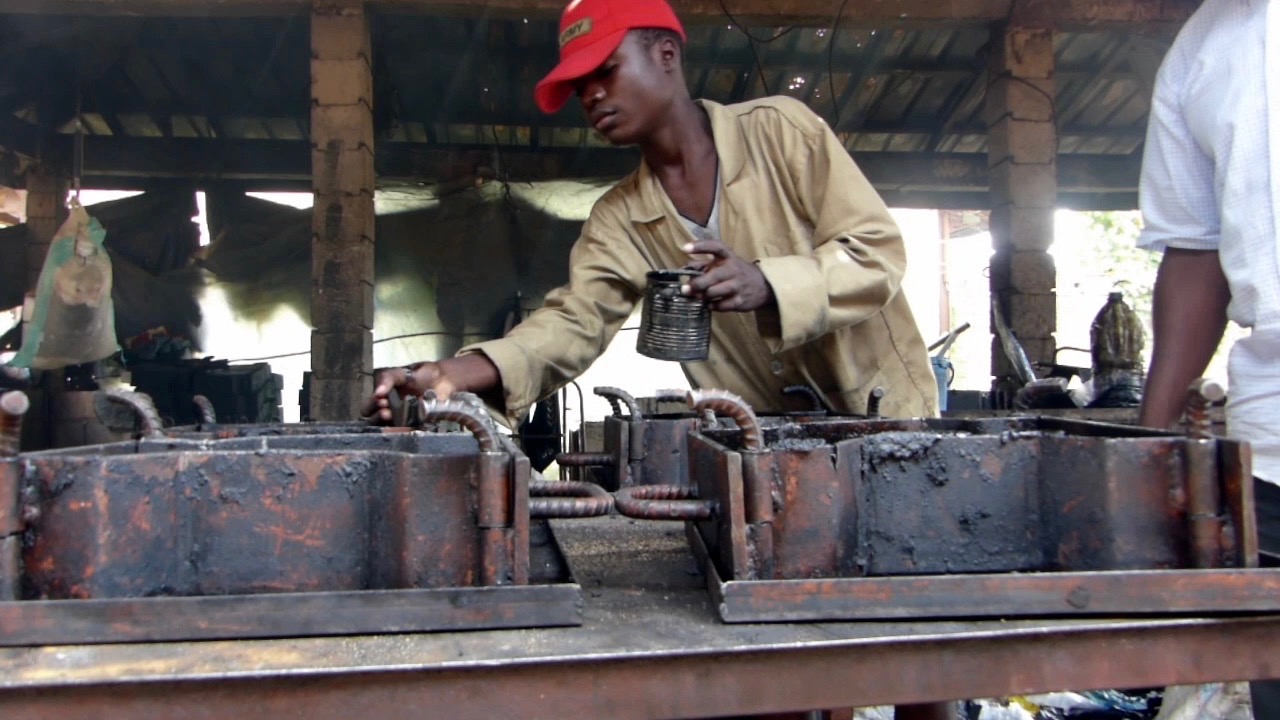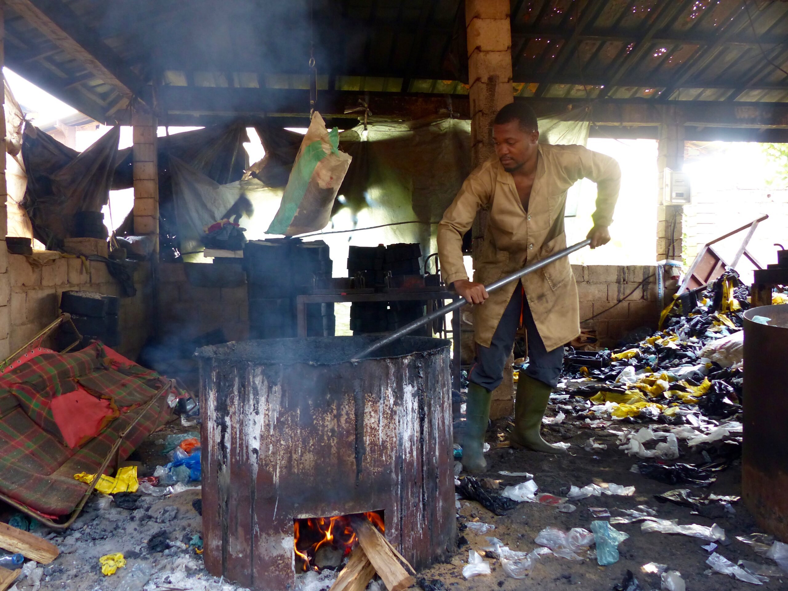 À côté, un garçon aux traits juvéniles est assis sur un grand matelas de sacs plastiques. Un à un il détache les emballages qui seront ensuite mis à fondre dans la marmite. Jephte Tangai a tout juste 17 ans, il présente le bac anglophone cette année. « Moi je vois le futur, je me bats pour mon avenir. Ce travail m’apporte une expérience professionnelle, et puis parce qu’on ne sait jamais : peut-être que ça m’aidera à nourrir ma famille plus tard », observe-t-il, prévoyant, avant d’ajouter les yeux brillants : « J’aimerais faire ce métier à l’avenir, je suis fier de ce que nous faisons ici. » L’autre objectif du projet : « créer de l’emploi local », comme l’explique le secrétaire exécutif : « Parmi ces jeunes que vous voyez là, il y a des étudiants mais aussi des jeunes des rues. L’atelier attire à la fois des universitaires qui veulent avoir un emploi décent dans une filière en plein développement, mais on amène aussi des jeunes en difficulté. Cela permet de les resocialiser et de leur donner un travail, loin des tentations et de l’oisiveté de la rue », détaille Pancrace Fegue, qui encadre les apprentis.