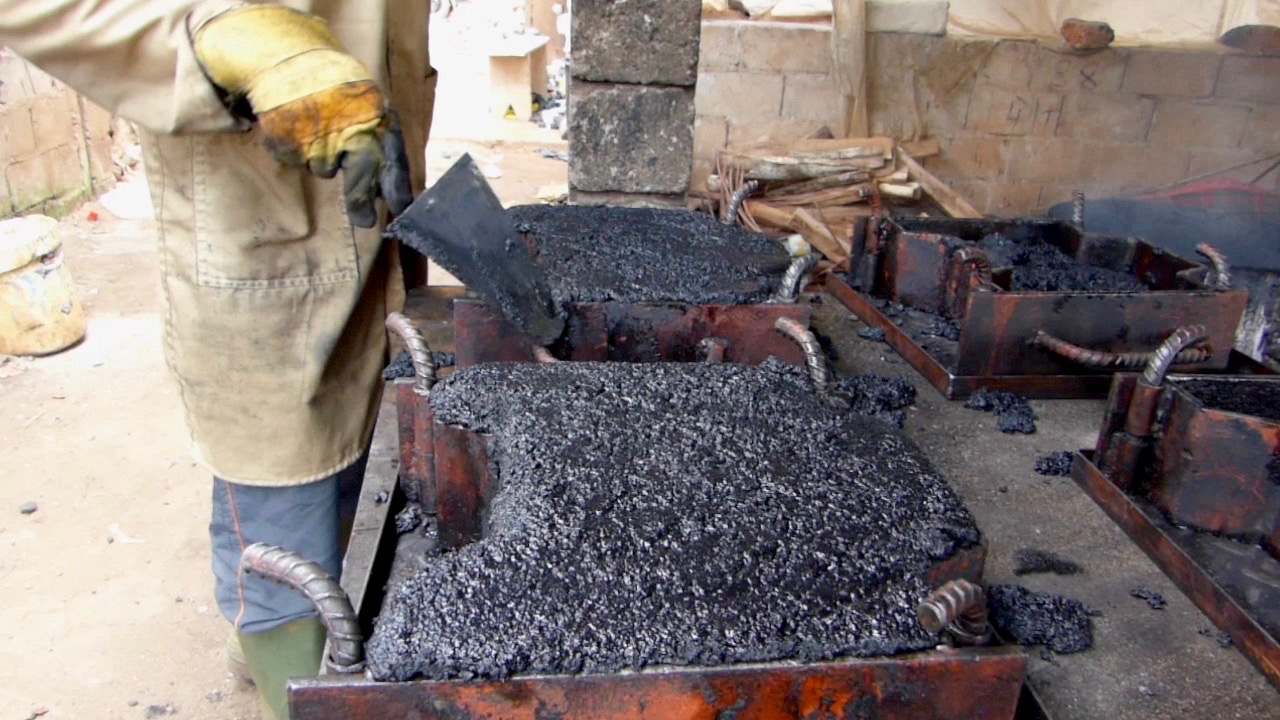 Sur le terrain vague de la voirie municipale de Yaoundé, au Cameroun, un drôle de laboratoire a vu le jour entre les montagnes de déchets qui jonchent le sol et le chaos des taxis jaunes stationnés sur la chaussée. Une épaisse fumée blanche se dégage d’un petit hangar au toit de tôles. En-dessous, une dizaine de jeunes, combinaison sur le dos et bottes en caoutchouc aux pieds, s’active autour d’un chaudron rempli de pâte noire. Le front perlant de sueur et des traces de suie sur les joues, Steve Armel Mbida Mbida remue la préparation brûlante à l’aide d’une grosse pelle. « Je fabrique des pavés écologiques », explique le jeune homme, le sourire aux lèvres, en faisant fondre des vieilles bouteilles en plastique et des sacs d’emballage dans une grande cuve chauffée à plus de 200°C. Une fois le plastique fondu, il ajoute du sable – « 60 % de sable, 40 % de plastique, c’est tout » – avant de verser la pâte obtenue dans des moules en fer. Au bout d’une vingtaine de minutes, c’est prêt.