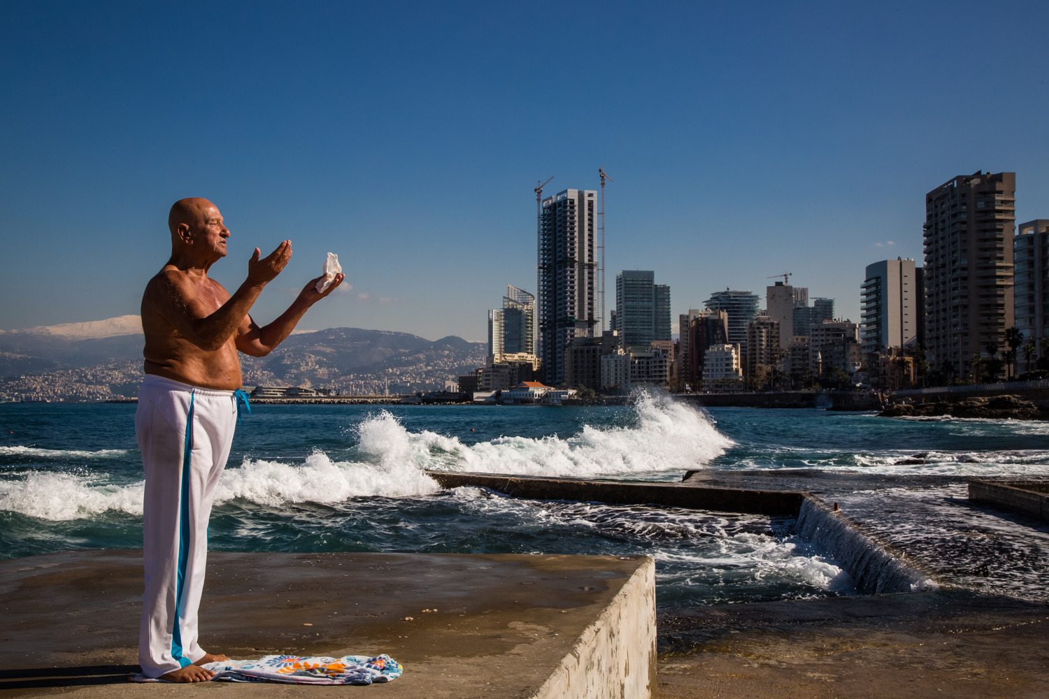 J’avais souvent du temps libre le matin. Un jour, alors que je me promenais le long de la Corniche de Beyrouth, j’ai pu apercevoir ces hommes près de la mer. J’ai tout de suite eu l’idée d’aller prendre quelques photos, avant de me raviser en pensant qu’ils ne se laisseraient pas faire. Plus tard dans la journée, sur le chemin du retour et après y avoir longuement réfléchi, j’ai finalement décidé de descendre sur la plage et d’aller les voir.