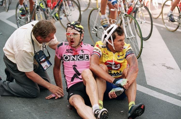 Trois ans plus tard, c’est au tour du belge Nelissen et de Laurent Jalabert de se payer la plus grosse bûche de leur carrière sur l’arrivée à Armentières. Le premier percute de plein fouet un gendarme resté sur la route. Jalabert lui roule dessus et termine en sang, après un soleil qui l’envoie en plein dans les barrières. Après ce choc ultra violent, le coureur tarnais de la ONCE n’ose plus se frotter aux sprints et se reconvertit en grimpeur baroudeur, jusqu’à décrocher le maillot à pois du Tour en 2001 et 2002.