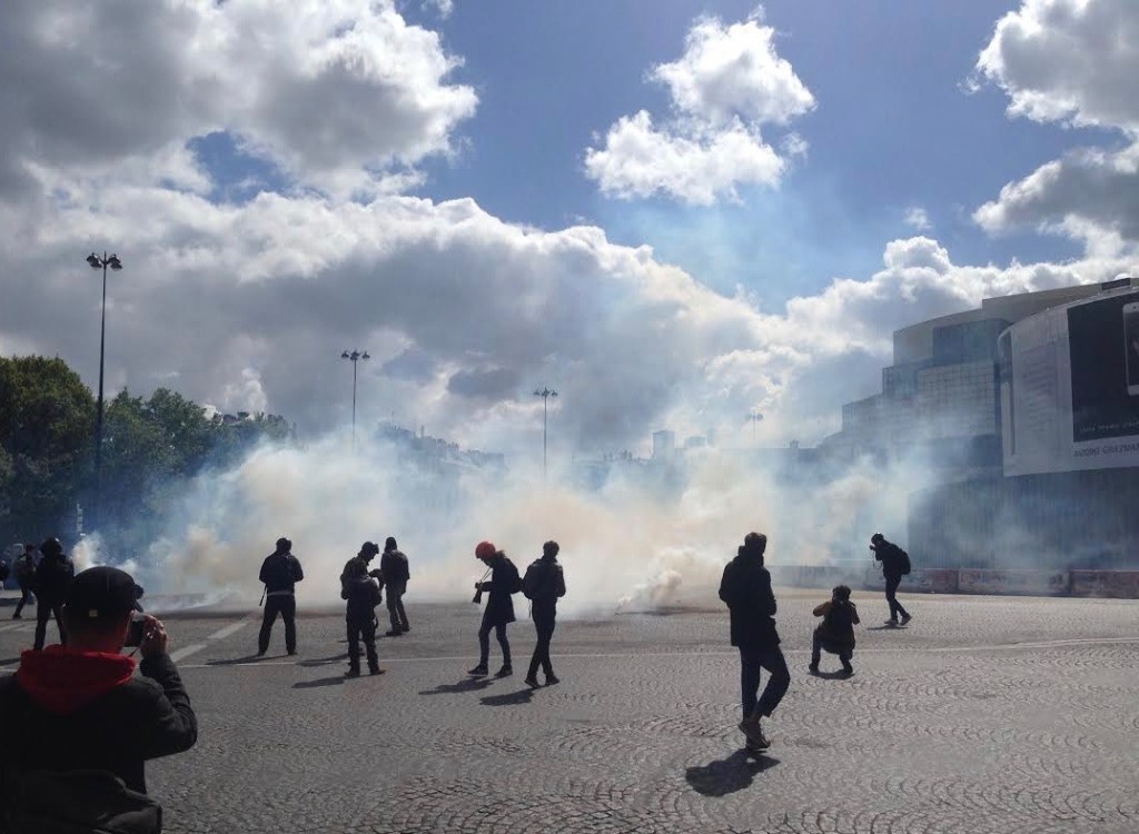 Quelques fumigènes verdâtres sont craqués, les slogans classiques « Ni Le Pen ni Macron ! Ni patrie ni patron ! » et « Tout le monde déteste le Front national ! » scandés. Les rideaux de fer des commerces se ferment. Les yeux des touristes s’écarquillent sur le passage des lycéens. Coincés dans leur bus en plein boulevard, des touristes chinois font des signes de la main aux manifestants. La police suit le cortège de près. Quelques manifestants explosent la vitrine d’une banque. Ils la barrent de l’inscription « Ni banquiers, ni faschistes (sic) ».