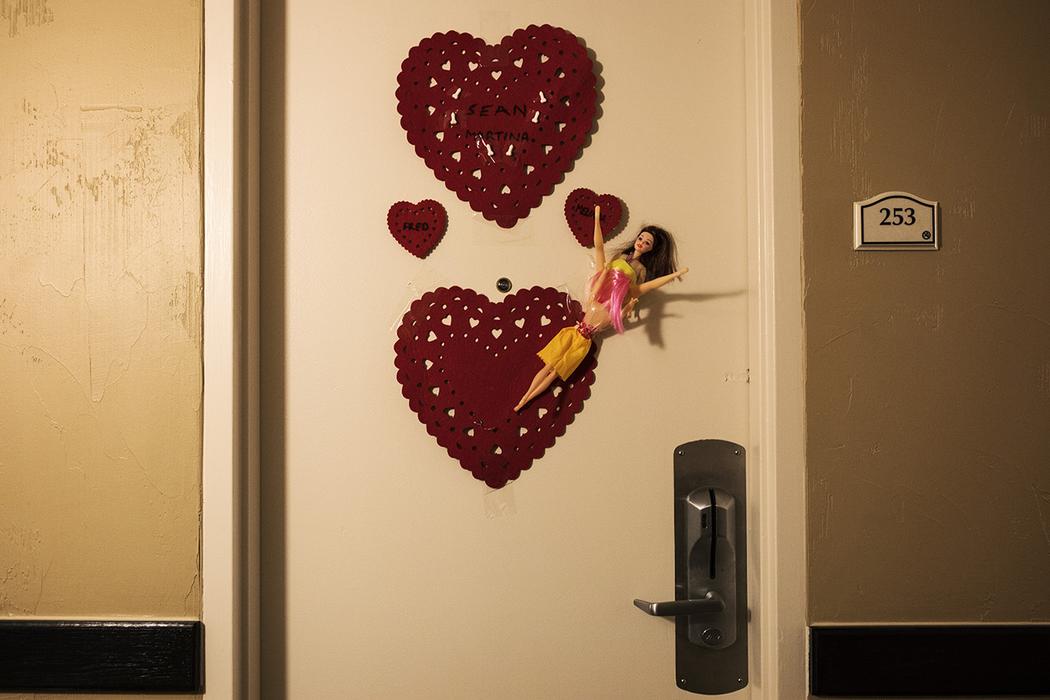 Dès mes premiers pas à l’intérieur de cet antre, je ne suis pas déçue. Tous les bibelots kitsch auxquels je m’attendais sont présents : des roses artificielles, de la dentelle et des bonbons en forme de cœur parsèment le sol du couloir. Une photographe et moi-même – toutes deux étrangères au monde de l’échangisme – sommes accueillies dans ce lieu de débauche pendant tout un week-end, pour en documenter les aspects les plus intimes. En retour, nous nous sommes engagées à ne pas divulguer le nom de l’hôtel.
