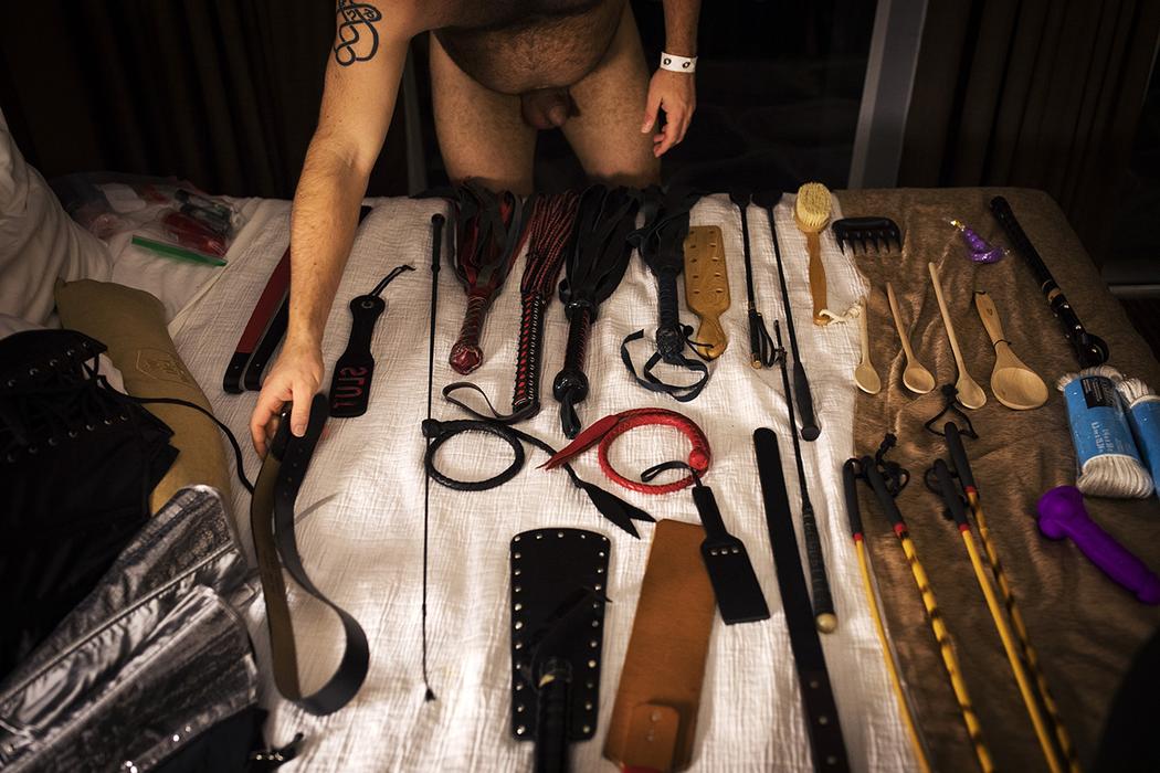 Liam nous présente sa vaste collection de jouets sexuels – des fouets, des cravaches, des vibromasseurs et j’en passe.