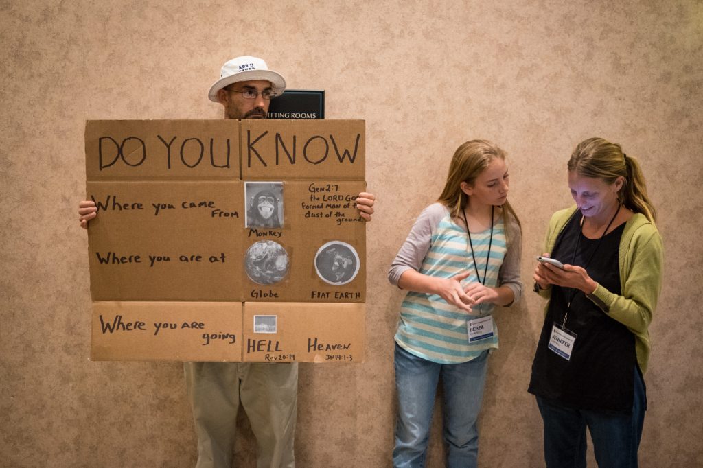 “De toutes les insultes que l’on peut adresser à quelqu’un, ‘platiste’ sera toujours pire que troglodyte, crétin, débilos“, m’a affirmé Rob Munroe, ingénieur en mécanique présent à la conférence. “Le fait d’être partisan de la théorie de la Terre plate signifie par défaut que l’on est louche, que l’on cache quelque chose.“